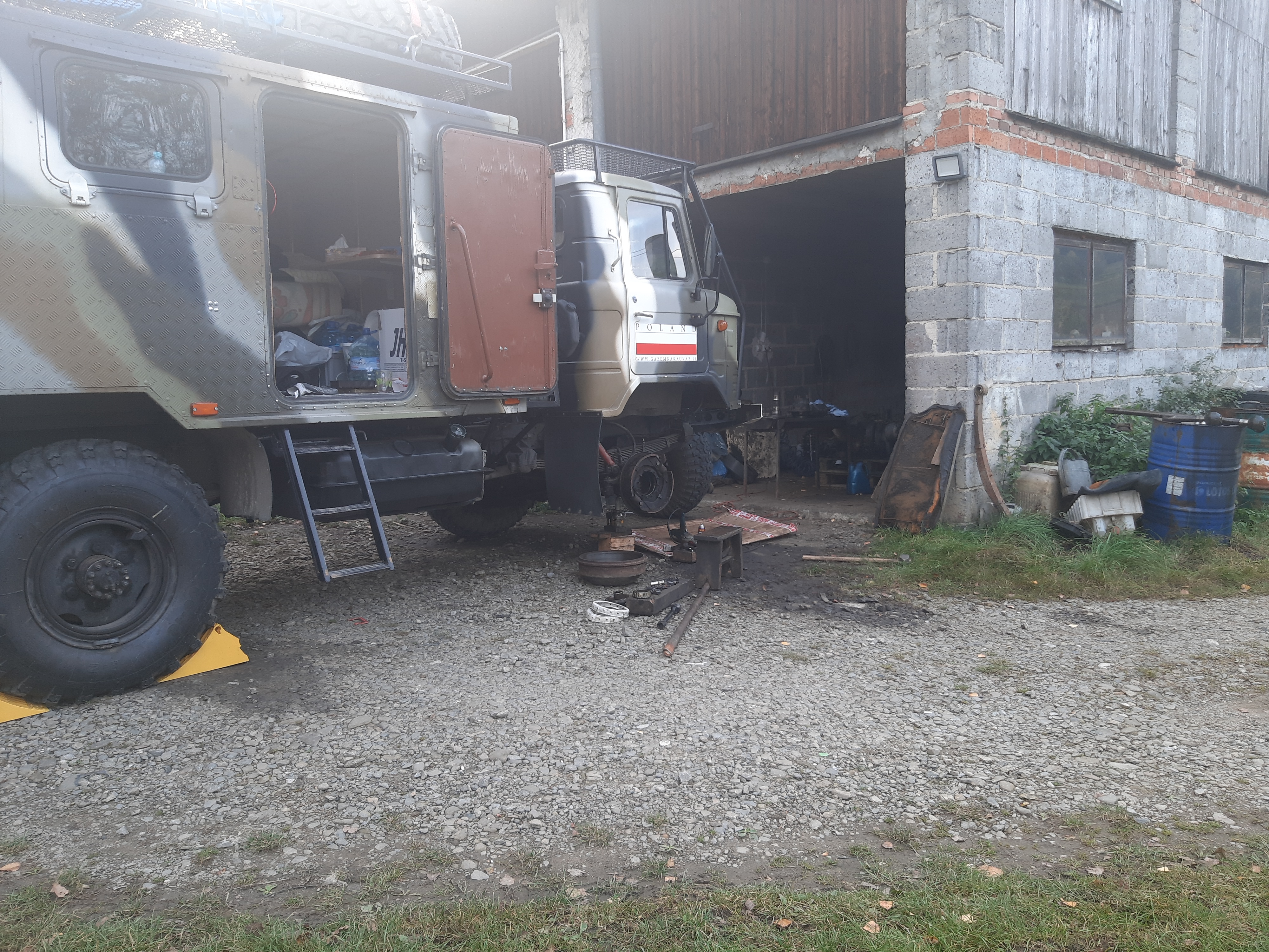 Rano wystartowałem z mocnym postanowieniem że pomimo wszystkich trudności jadę dalej. No tak co z tego że mam mocne postanowienie kontynuowania podróży, jak samochód nie pozwala tego postanowienia realizować. Jadę w stronę Barwinka, licząc że opony się rozgrzeją, ułożą i nagle wszystko będzie dobrze, niestety ledwo dojechałem na stację benzynową przed granicą. Nie mogę tak jechać bo jeszcze coś się urwie, złamie, zablokuje i spowoduję (przez swój głupim upór) jakiś wypadek. Już wszystkie jakieś awarie są naprawione zostają „tylko” te koła. W Internecie znalazłem firmę z Rzeszowa, która ogłasza się że ma koła na 6 śrub i tak ze zdjęcia chyba pasują do mojego samochodu. Zadzwoniłem i po rozmowie z panem nabrałem otuchy że jednak coś się wymyśli. Postanowiłem że jadę do Rzeszowa, kupuję koła (takie do ciężarówek z oponami „szosowymi”) jak będzie dobrze to zawracam i jadę dalej. W sumie miałbym 4 koła terenowe (na bagażniku) i komplet kół szosowych (na samochodzie). Na tych kołach spokojnie przejechałbym do Gruzji po dobrych drogach, a tam już na miejscu zmieniłbym sobie na koła terenowe, które bardzo dobrze się spiszą w terenie górskim. Jadę, ale już tak wolno że ledwo się snuję, drogi górskie, podjazdy, zjazdy - nie ma gdzie się schować żeby zrobić miejsce dla samochodów jadących za mną i żeby mnie wyprzedzili. Na jakimś przystanku/zatoczce naliczyłem 40 samochodów które jechały za mną nie mogąc mnie wyprzedzić. Niestety nic z tych moich planów nie wyszło, rozstaw śrub na feldze różnił się od tych moich, niby to samo, ale jednak nie tak samo. W tej sytuacji nie mogę już jechać dalej, trzeba podjąć decyzję co robić dalej.