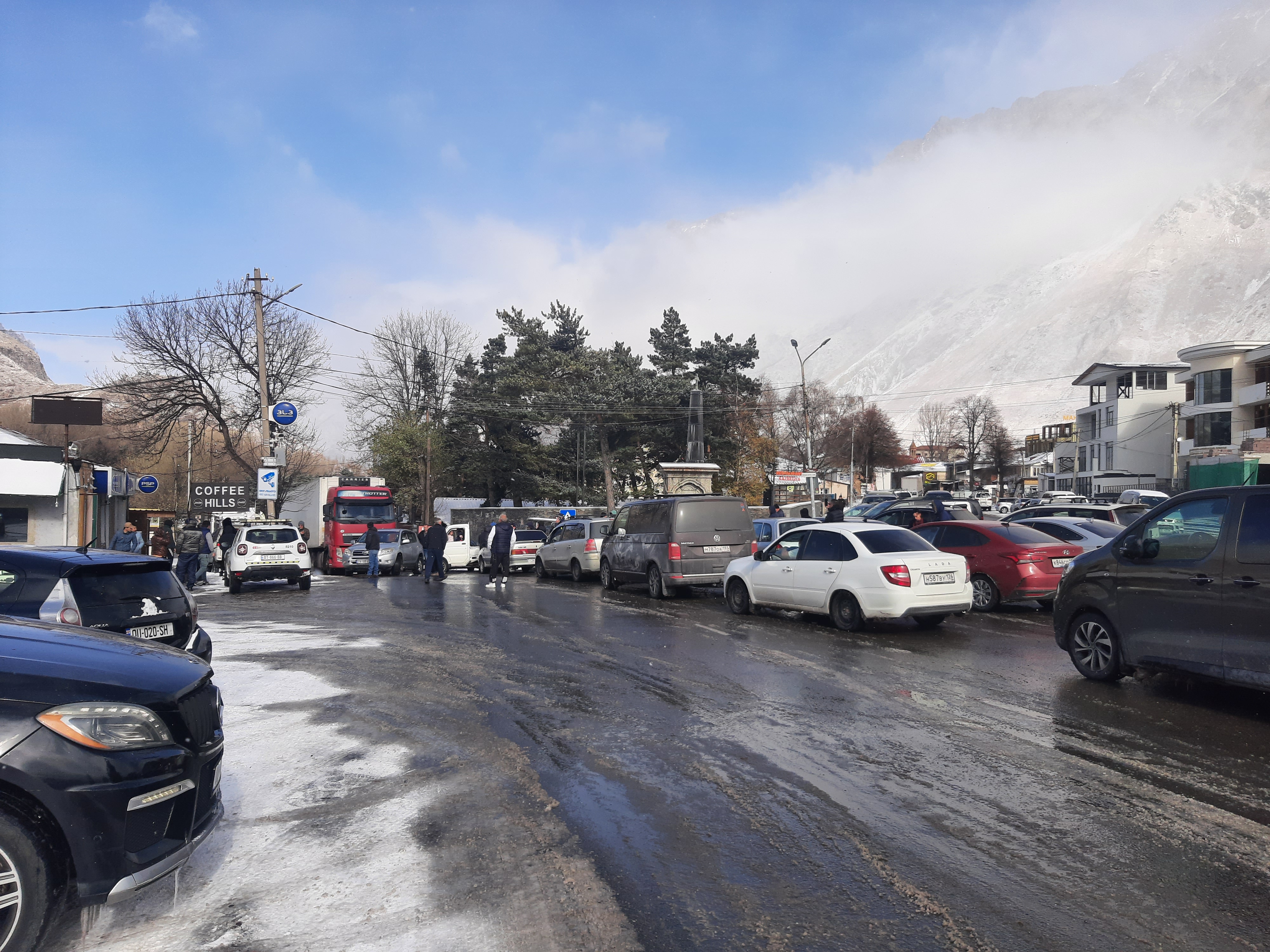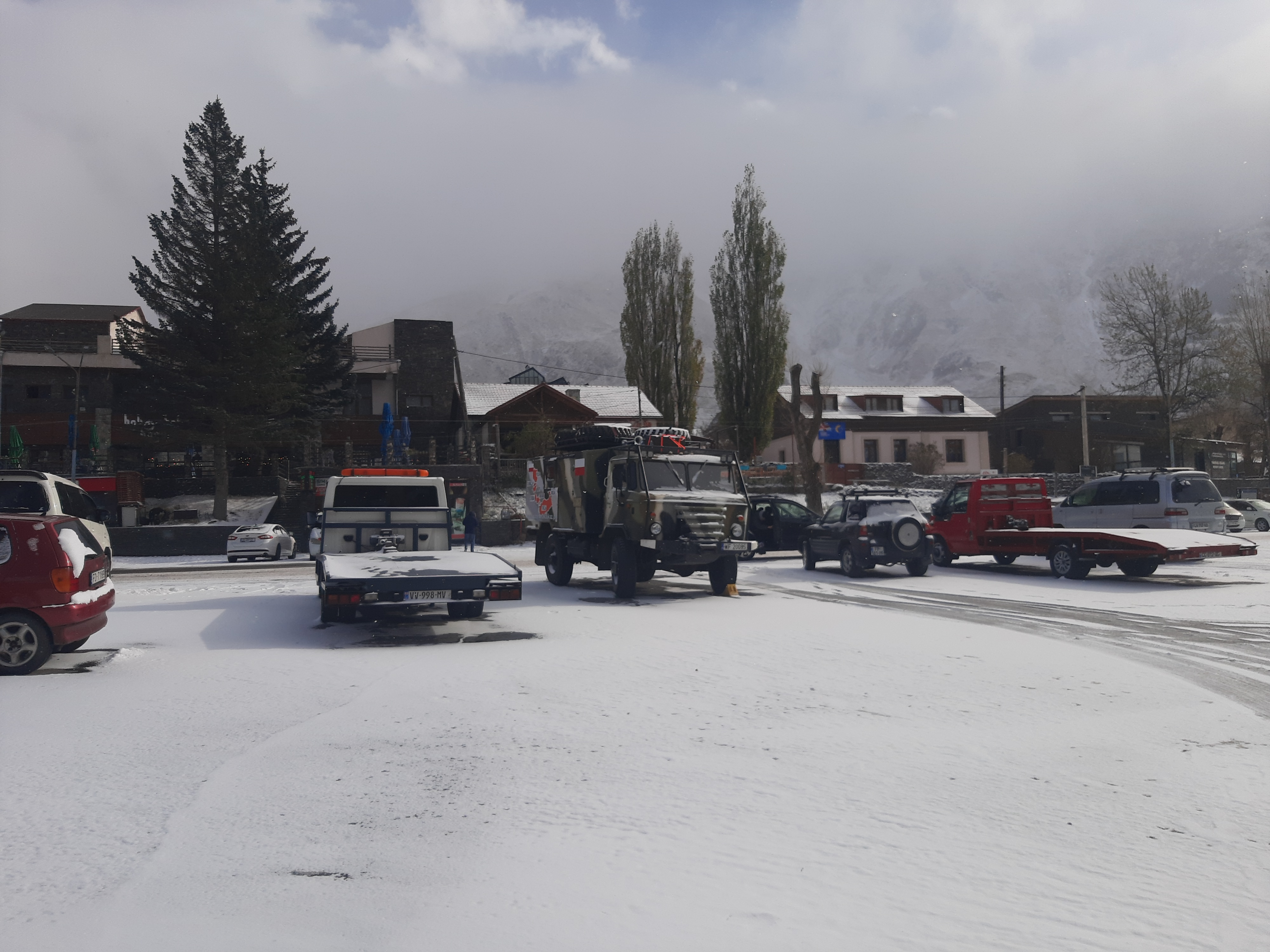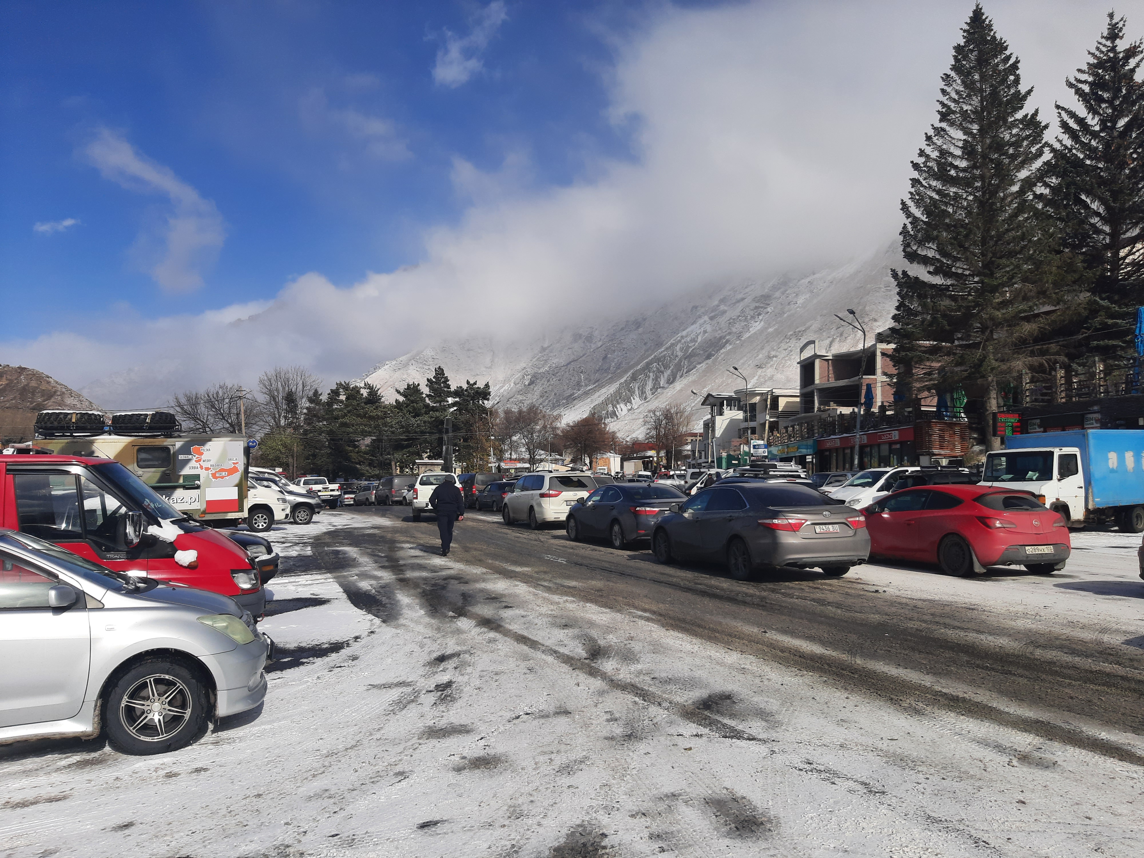 W nocy zaczął padać śnieg, nic wielkiego pomyślałem. Rano okazało się że to jest śnieżyca i mocno zawiewa. No to mam problem, a w zasadzie dwa. Pierwszy to nie mam łańcuchów na koła, a bez tego nie pokonam tych gór i nie zjadę na dół, a drugi problem to paliwo letnie. Zatankowałem oba zbiorniki w okolicy Tbilisi i nie pomyślałem że jak pojadę w góry to może spaść temperatura i nie dolałem tego dodatku do ropy. Patrzyłem smętnie przez okno jak sypie śniegiem, o złych warunkach na drodze świadczył też fakt że nie jechał żaden Tir, ani do granicy, ani z granicy. Tak więc na razie zostaję w Stepantsmindzie. Patrzę na pogodę i widzę że jutro chyba będzie lepiej. Zobaczymy. W międzyczasie zamknęli drogę na parę godzin i żaden samochód nie jechał do góry i na dół. Zrobiłem zdjęcie korka jaki utworzył się z zatrzymanych samochodów. No to co miałem robić, poszedłem znowu na kolację popijaną czaczą do Gruzina i zeszło się do nocy.