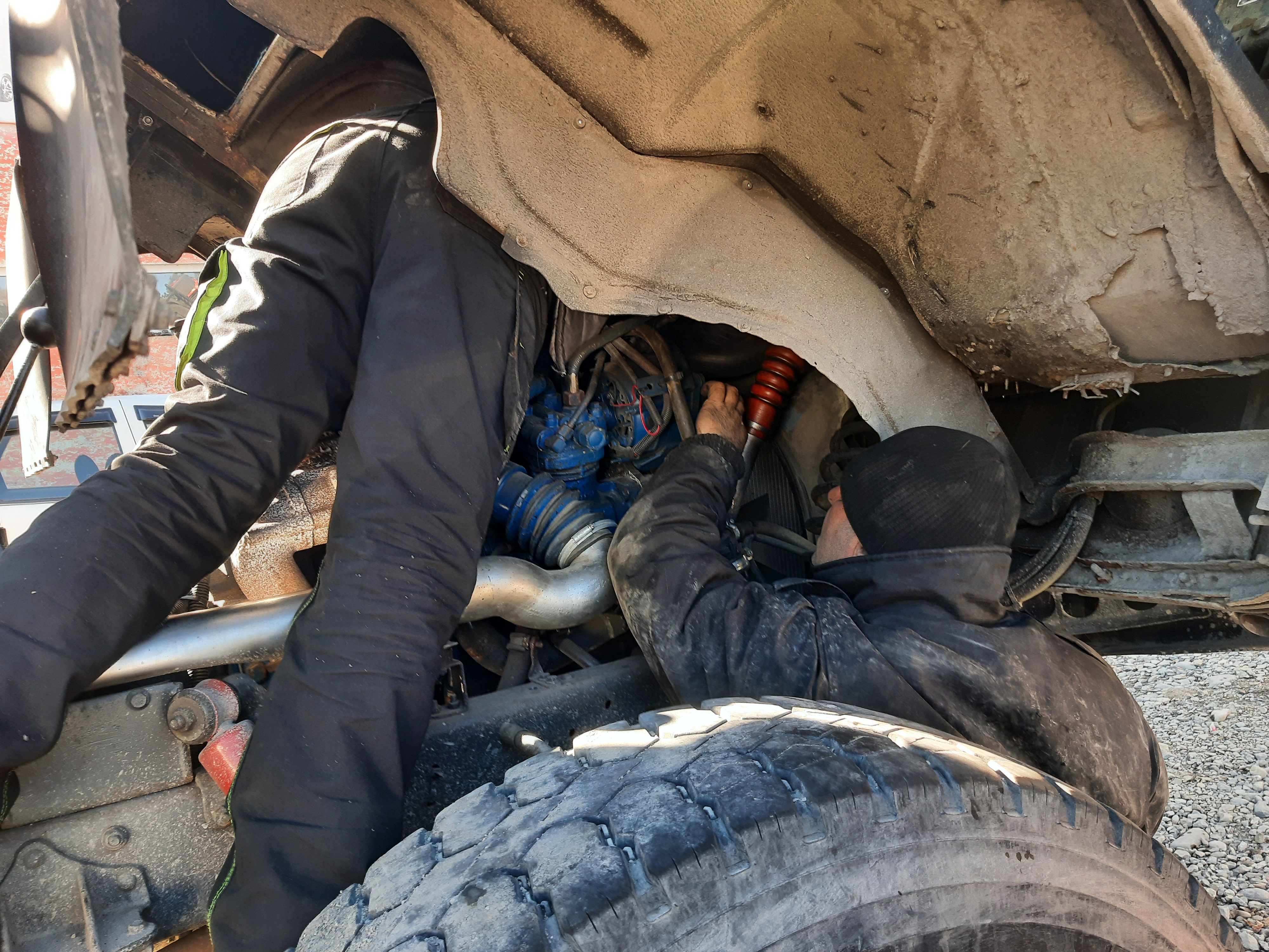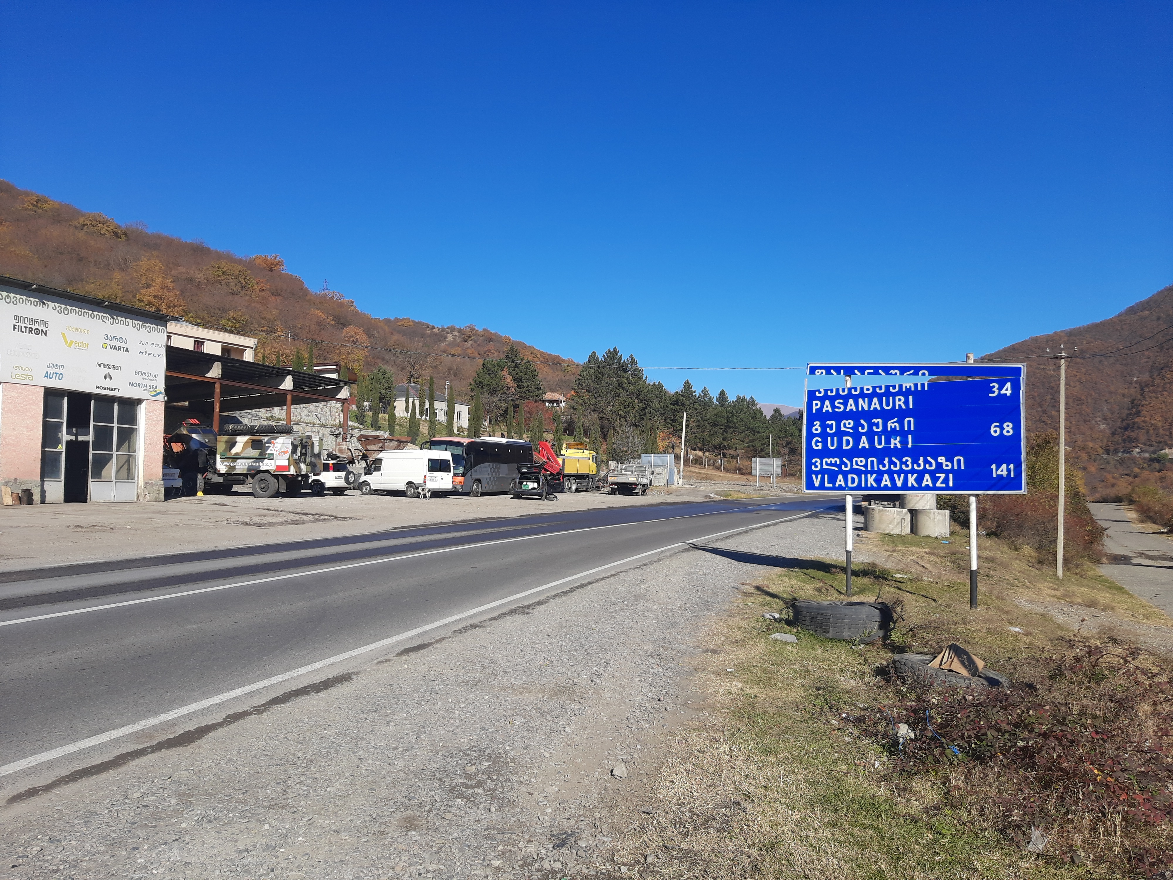 Czas w podróży 3 godziny, ilość przejechanych kilometrów – 60. Jak mi kazali, tak przyjechałem - rano. Podniosłem kabinę, zebrał się sztab 3 mechaników i zaczęli oglądać i słuchać. Zgodnie orzekli że to musi być pompa wody. I pytanie do mnie czy rozbieramy, ale nie ma gwarancji że taką dostanę w Tbilisi. Rozbieramy, jeśli nie będzie to będę się później tym martwił. Ustaliliśmy cenę: za naprawę 300 Lari (ok. 450 zł), a taksówkarzowi, który mnie zawiezie do Tbilisi 100 Lari. Z wymontowaną pompą pojechaliśmy do miasta. Kierowca, który mnie wiózł to istny demon w pełni tego słowa znaczeniu. Już po pięciu minutach jazdy powiedziałem sobie że nie będę patrzył do przodu. Wyprzedzanie na trzeciego, bez kierunkowskazów, zajeżdżanie drogi, a wszystko to w szaleńczym tempie. Pomyślałem sobie, że przecież nie po to przejechałem 4 000 kilometrów, żeby teraz zginąć na drodze do Tbilisi, i że na pewno dojedziemy do magazynu i wrócimy do warsztatu szczęśliwie. W magazynie po pokazaniu części zapadła konsternacja, co źle wróżyło mojej części. Coś tam panowie rozmawiali, kręcili głowami, patrzyli w komputer, kurczę (żeby nie powiedzieć inaczej), pewnie nic z tego, przeraziłem się nie na żarty. Dobra, razem z taksówkarzem poszliśmy przeglądać części, już za drugi podejściem sprzedawca znalazł taką samą pompę. Jeszcze tylko zapłacić (480 Lari) i z powrót z demonicznym taksówkarzem do warsztatu. Na miejscu pan Remontier obejrzał po swojemu i powiedział że dobra część, montaż trwał ok. godziny, do tego później uzupełnianie płynu, całość prac zeszła się do 14. Zapłaciłem podziękowałem, poprosiłem o wspólną fotografię i wyruszyłem w drogę. Plan na najbliższe dni to jechać do Signaghi, jest to rejon słynący z uprawy winorośli i doskonałego wina. Można tam dojechać dwoma drogami przez Tbilisi i przez góry, ja będę jechał tą trudniejszą drogą przez góry. Zrobiłem zdjęcie drogi, która ciągnie się zboczem góry. Dzisiaj dojechałem do miasteczka Tianeti, ponieważ już się późno zrobiło postanowiłem tutaj zostać na noc. Akurat przy głównym placu jest komisariat, poszedłem tam i zapytałem czy mogę gdzieś tutaj bezpiecznie zostać na noc. Przy okazji opowiedziałem im, że już przejechałem tyle kilometrów z Polski, że jestem 19 dni w podróży i takie tam jeszcze historie. Panowie policjanci wskazali mi miejsce przed bankiem i powiedzieli że tam mogę śmiało zostać na noc.