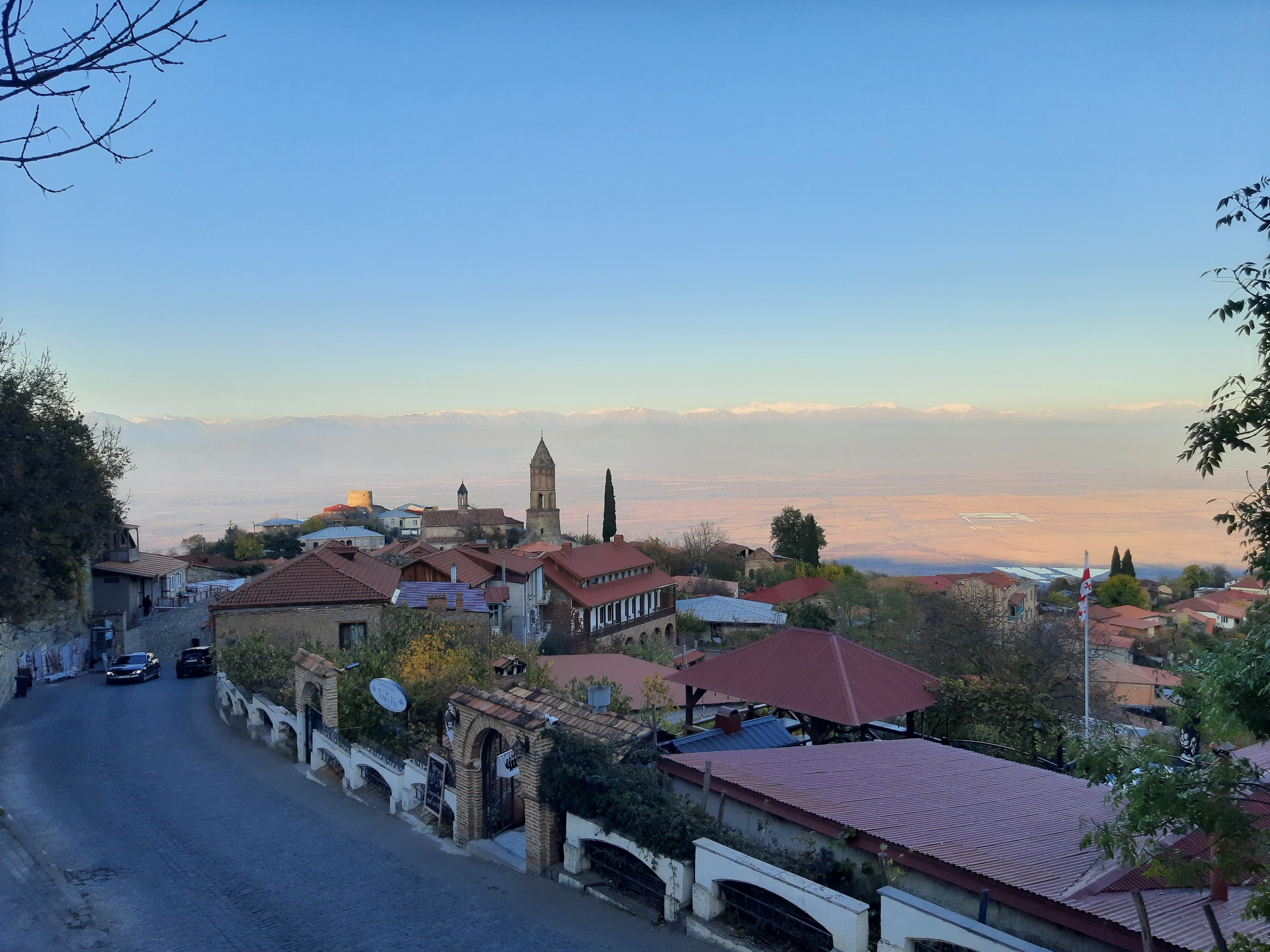 Czas w podróży 9 godziny, ilość przejechanych kilometrów – 160. Droga do Sighnaghi zajęła mi 9 godzin. Ciężko się jechało przez góry, no ale to już jest dla mnie normą a nie wyjątkiem. Chciałem tu przyjechać z dwóch powodów. Pierwszy, to w opisach różnych ludzi jest to piękne miasteczko z w klimacie włoskich małych miasteczek. Odbudowane i zadbane dzięki staraniom prezydenta Saakaszwilego, ponoć prezydent przylatywał helikopterem tu zjeść coś dobrego. Może prawda, a może kolejna miejska legenda. Drugi powód to wspaniałe wina. Ponieważ przyjechałem już dobrze po południu, to nim się jakoś ogarnąłem zrobił się wieczór. Trochę połaziłem po miasteczku i faktycznie wieczorem wyglądało bardzo ładnie. Poszedłem na kolację do jakiejś małej restauracji, gdzie coś zjadłem i kupiłem parę butelek wina. Oczywiście nie kupuję wina w marketach, tylko, albo w winnicach, albo właśnie w restauracjach gdzie najczęściej, albo właściciel robi wino, albo ktoś z rodziny. Ponieważ już dosyć długo nie było się gdzie wykąpać na noc zostałem w hotelu Traveler. Rano po śniadaniu poszedłem sobie kupić chleb i za dnia trochę pochodzić.