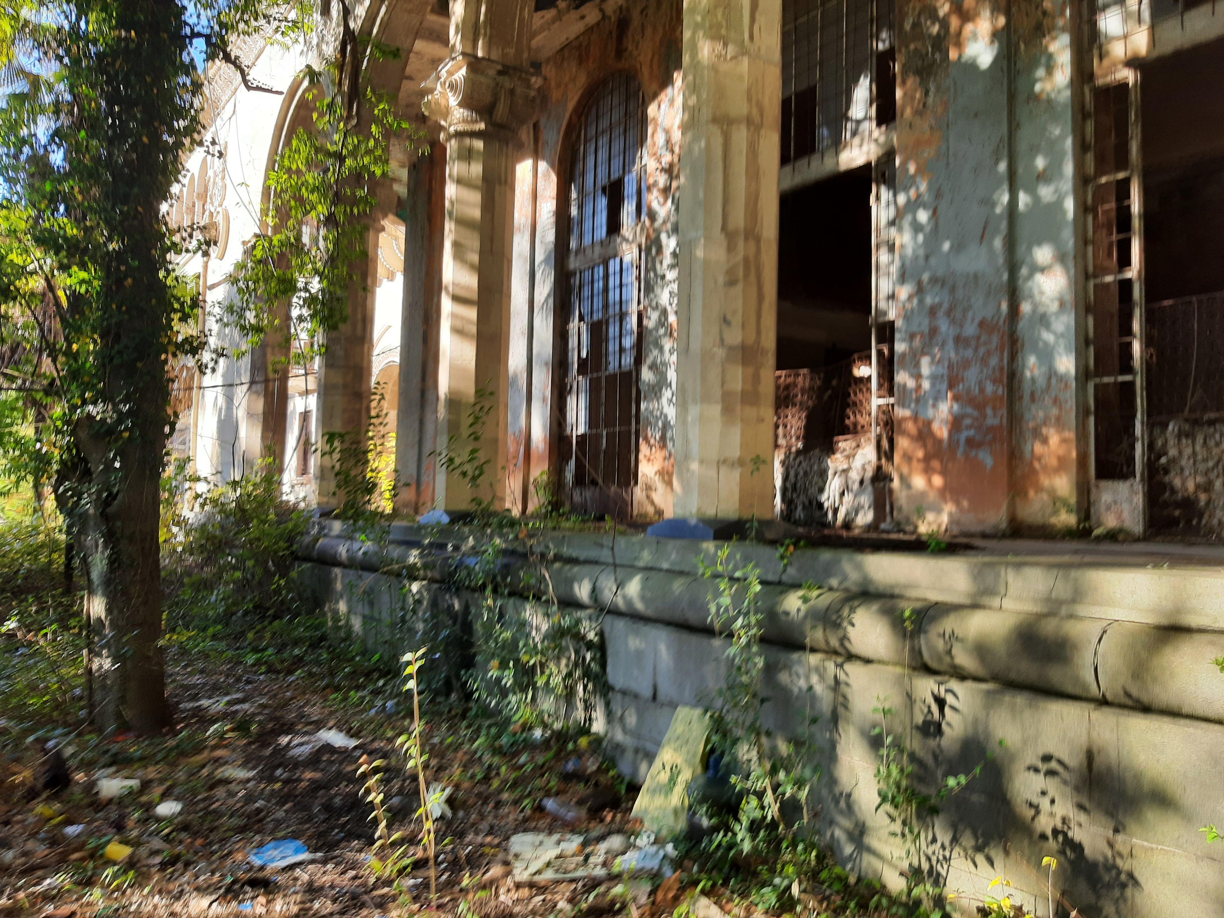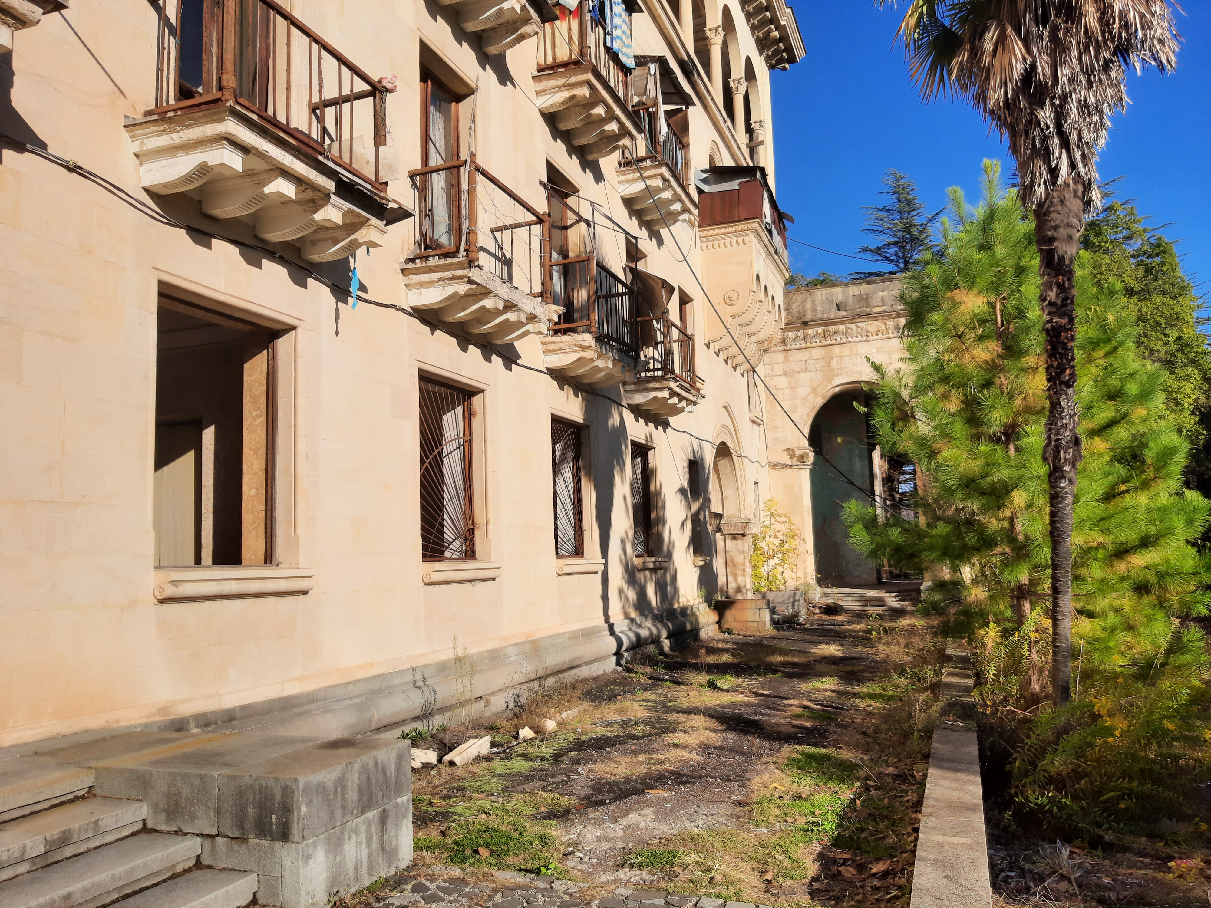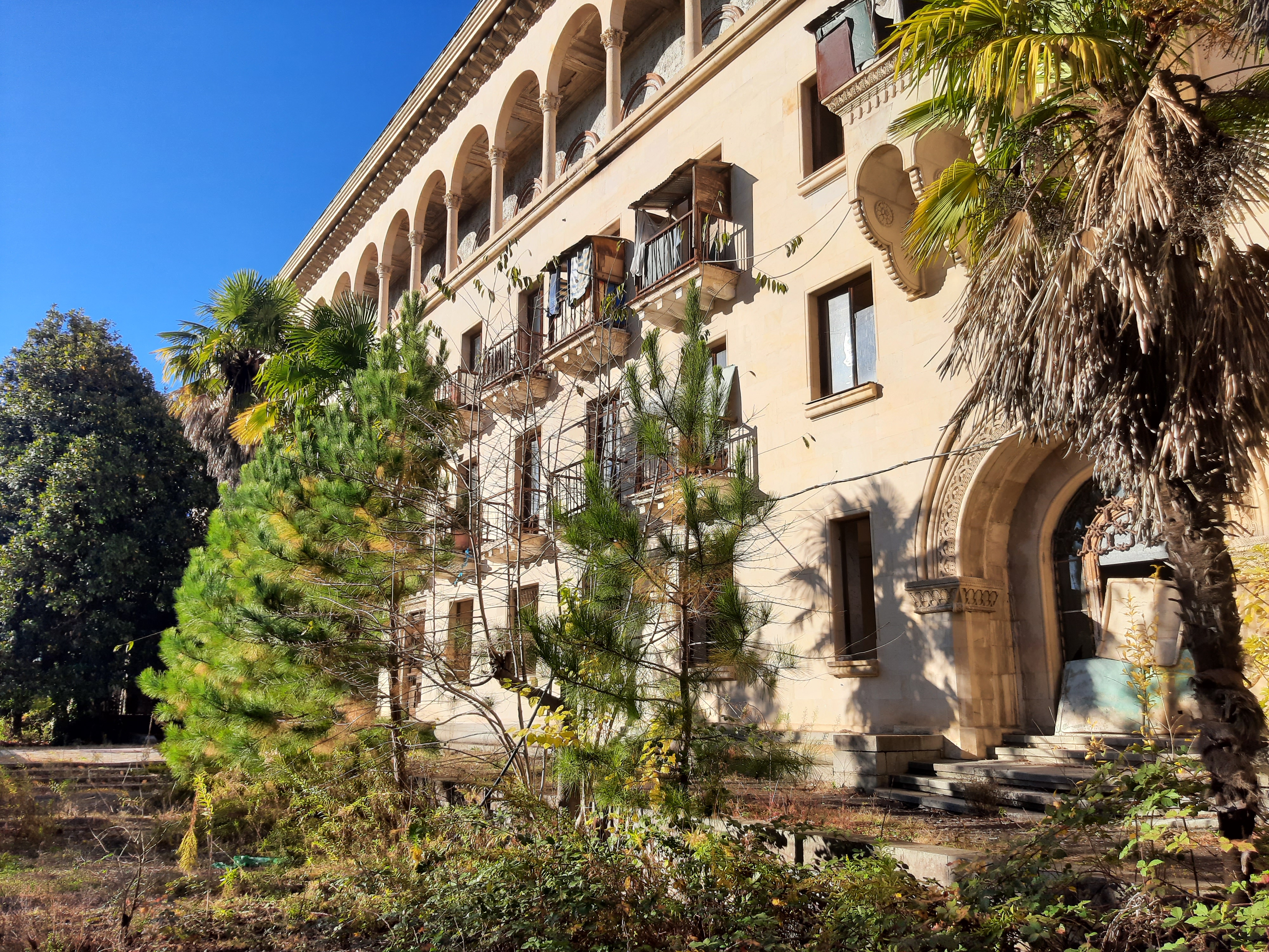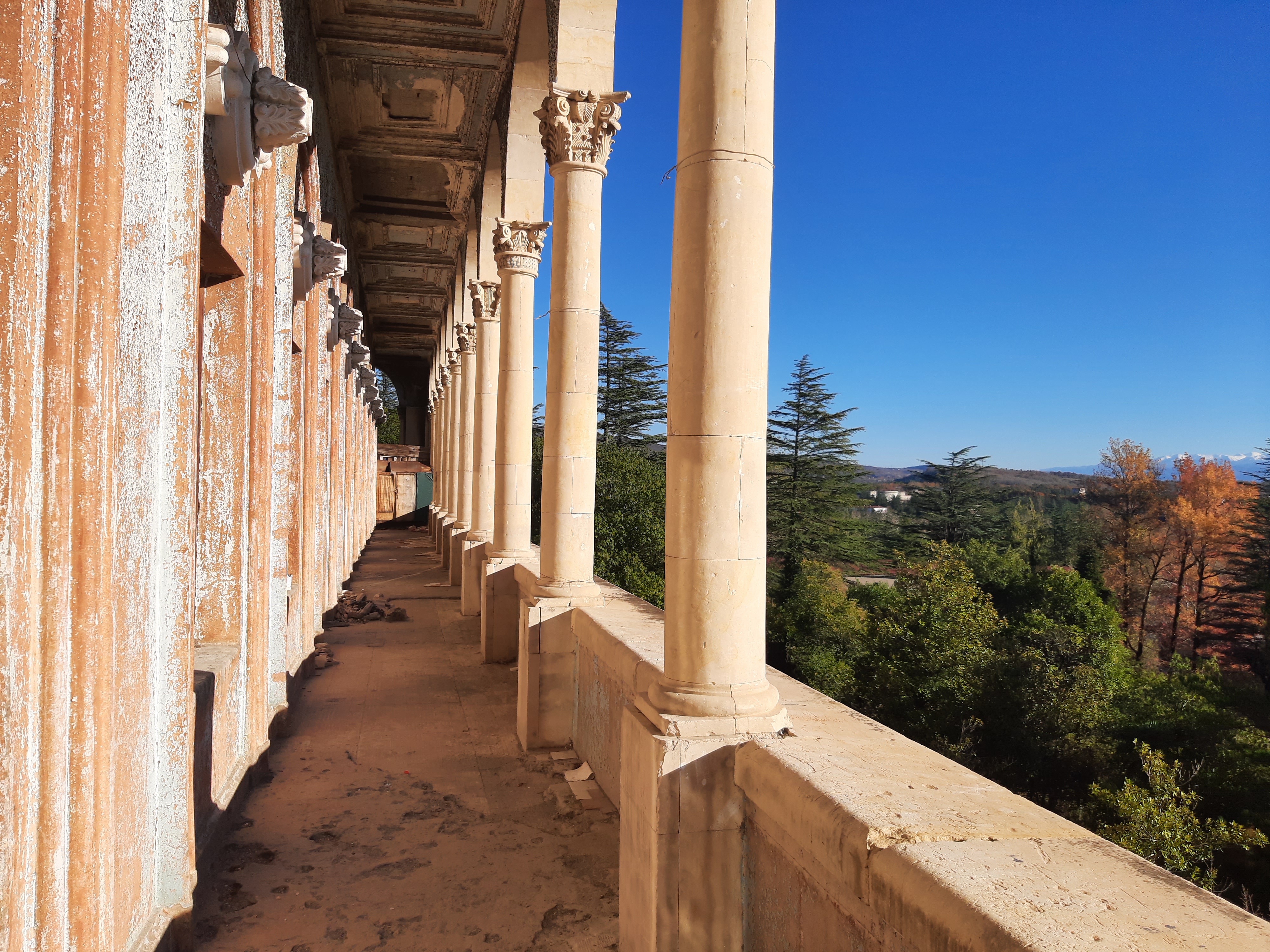 17-XI-2024 czas w podróży 9 godzin, ilość przejechanych kilometrów – 220 Dzisiaj minęły 4 tygodnie jak jestem w podróży. Do tej pory przejechałem 5 303 kilometrów, samochód oprócz awarii pompy wodnej spisuje się bez zarzutów. Sporo miał roboty na stepie (Udabno-Sighnaghi) i w górach w Vashlovani. Teraz pomału zaczynam już jechać z powrotem. Jednak pojadę najpierw obejrzeć ruiny/pozostałości po sanatorium Medea koło miasta Ckaltubo, później dwa kaniony, później do Ushguli (wioski w górach), później skalne miasto Vardzia, a później nie wiem co jeszcze. O opuszczonym sanatorium przeczytałem w Internecie i uznałem że warto go zwiedzić. Po odkryciu wód leczniczych zaczęto rozbudowywać infrastrukturę sanatoryjną, a w latach 30 miasteczko uzyskało status państwowego uzdrowiska. Wielokrotnie też przebywał tu Stalin. W latach rozkwitu pociągi z Moskwy dowoziły tu kuracjuszy cztery razy dziennie. Po rozpadzie ZSRR powoli obiekty popadały w ruinę. Ponieważ lubię łazić po takich starych/zapomnianych budowlach to zeszło mi się sporo czasu. W głównym budynku pani, która tam siedziała, kazała mi zapłacić parę lari za możliwość zrobienia zdjęć i obejrzenia budynku od środka. Jeszcze teraz robią wrażenia marmurowe kolumny, żyrandol i sala koncertowa. Nawet nie miałem pojęcia jak duży był ten kompleks sanatoryjny. Gdy jechałem przez drzewa prześwitywały olbrzymie budynki, a właściwie ich szkielety. Pomyślałem sobie że w nocy to dopiero musi tutaj wiać grozą. Dalej już pojechałem do kanionu Martwili, gdzie zostałem na noc na parkingu.