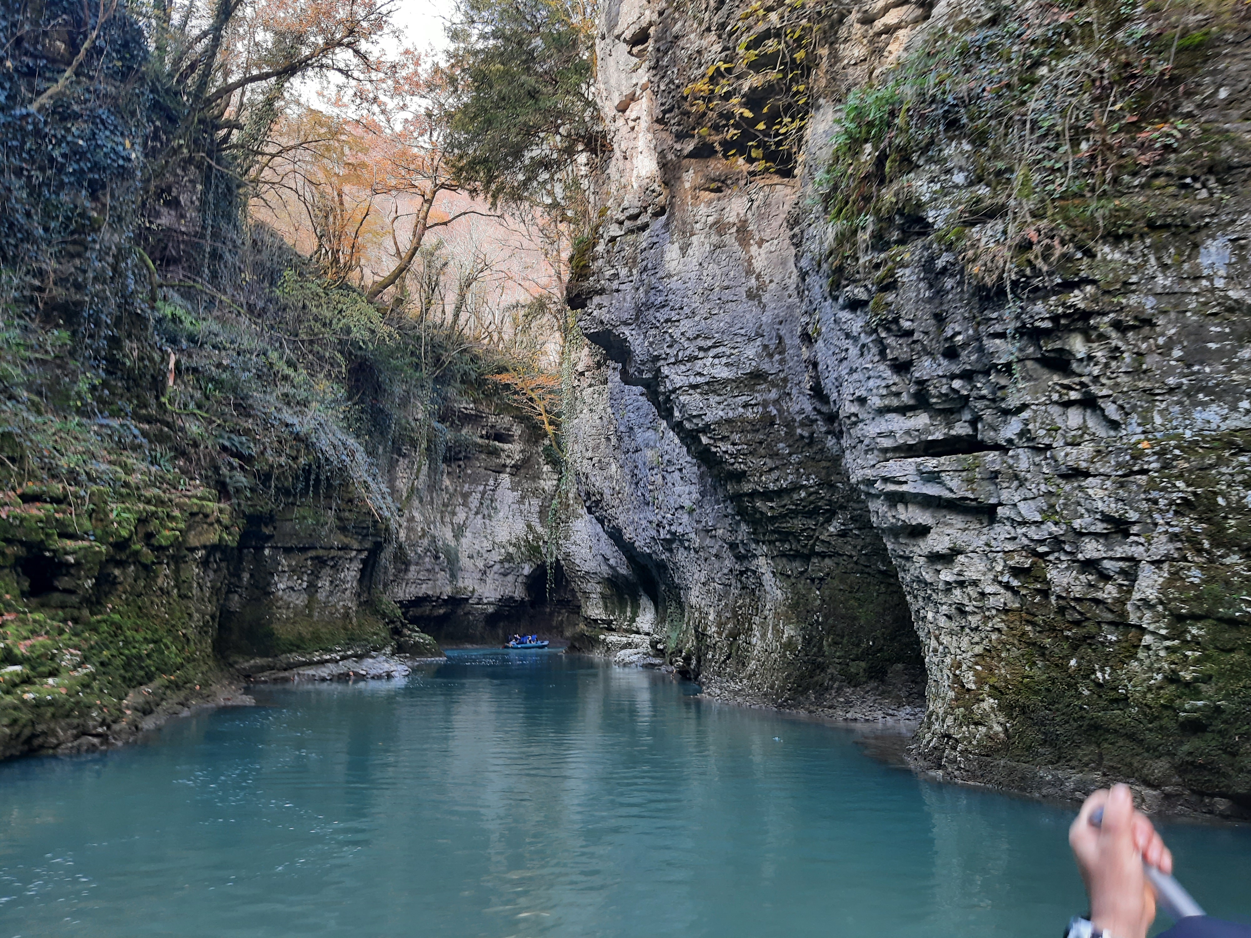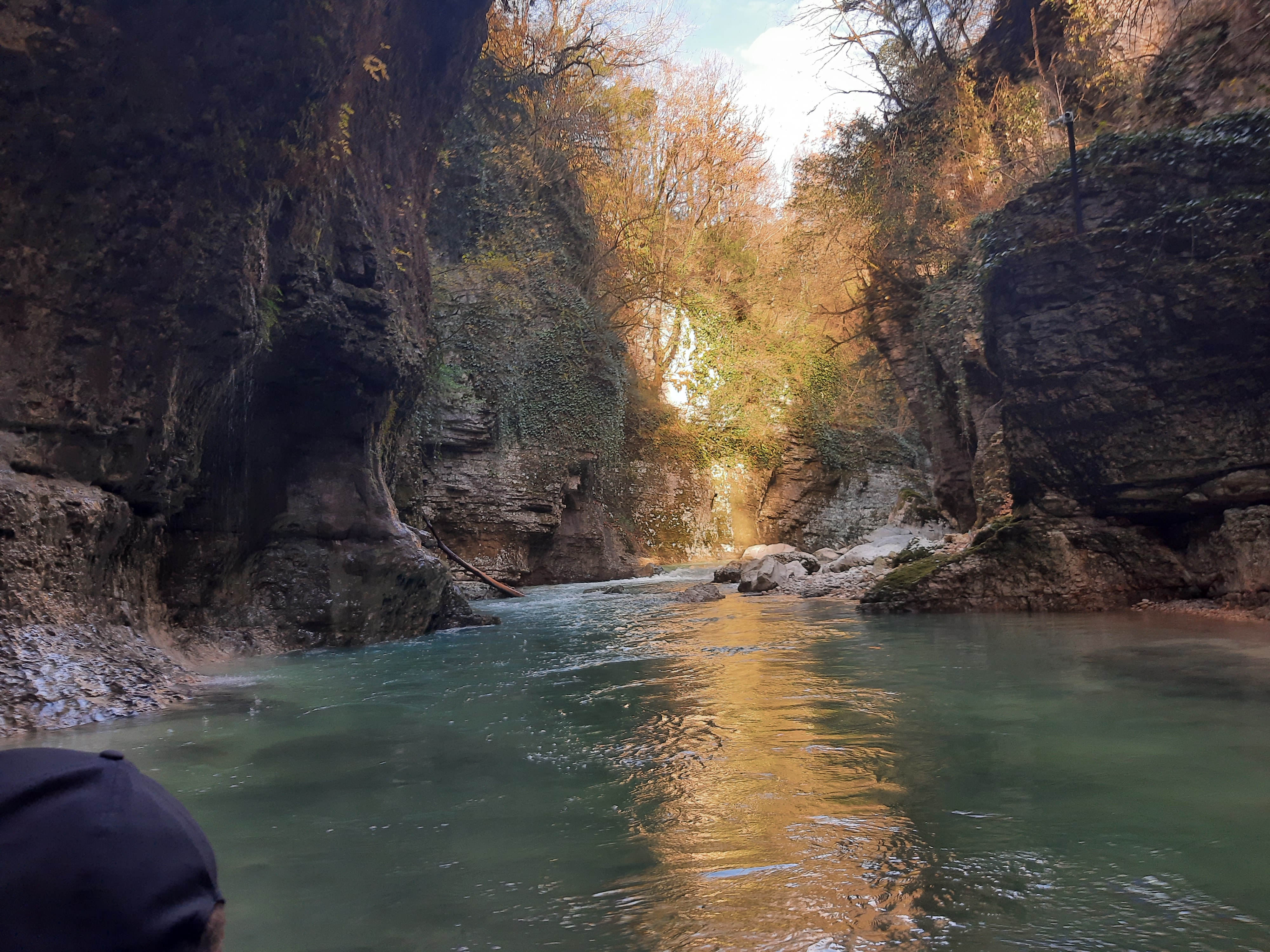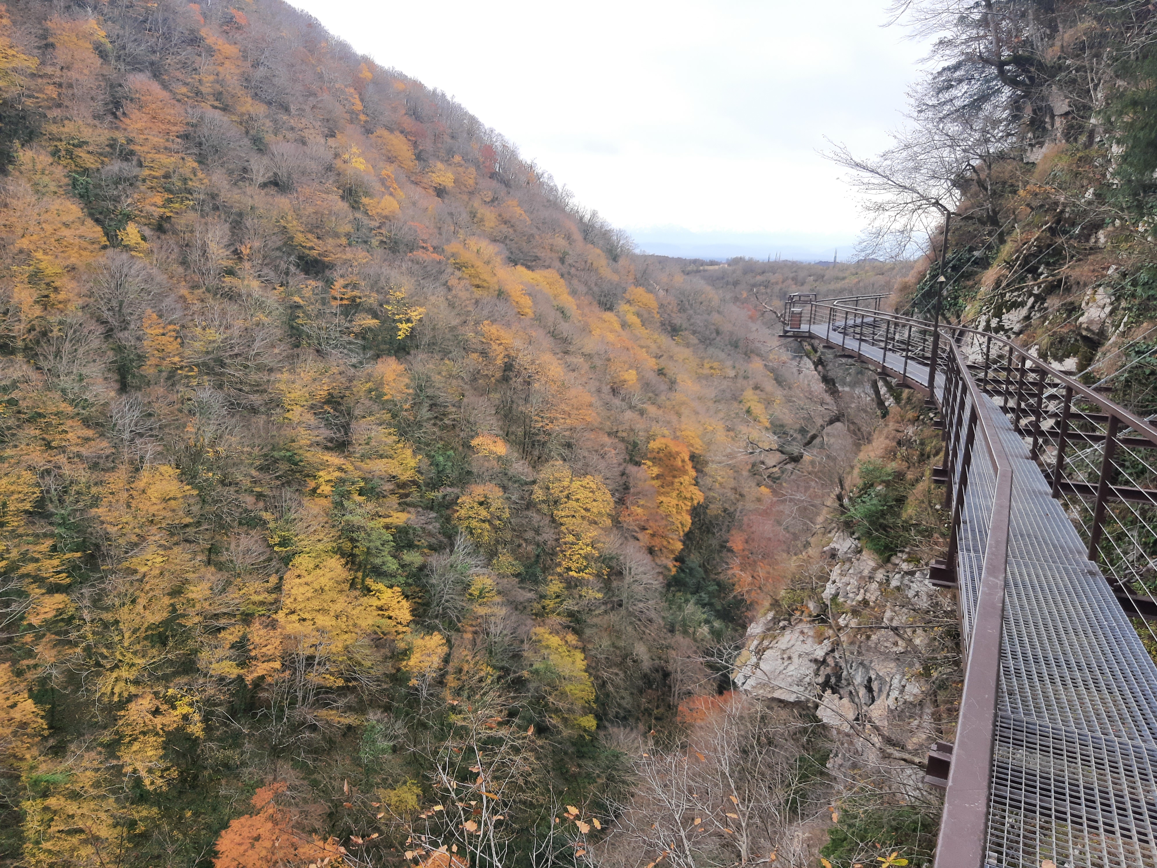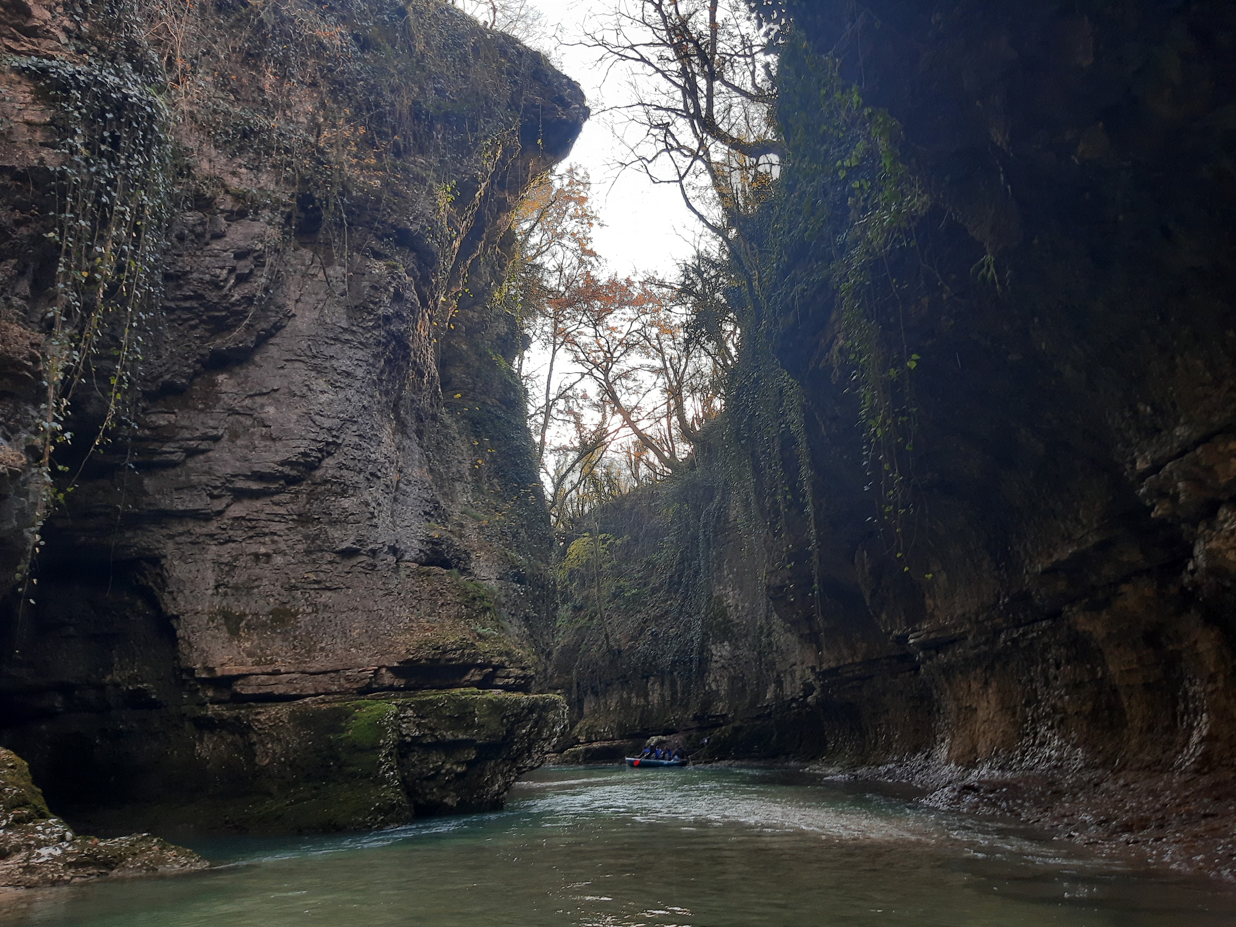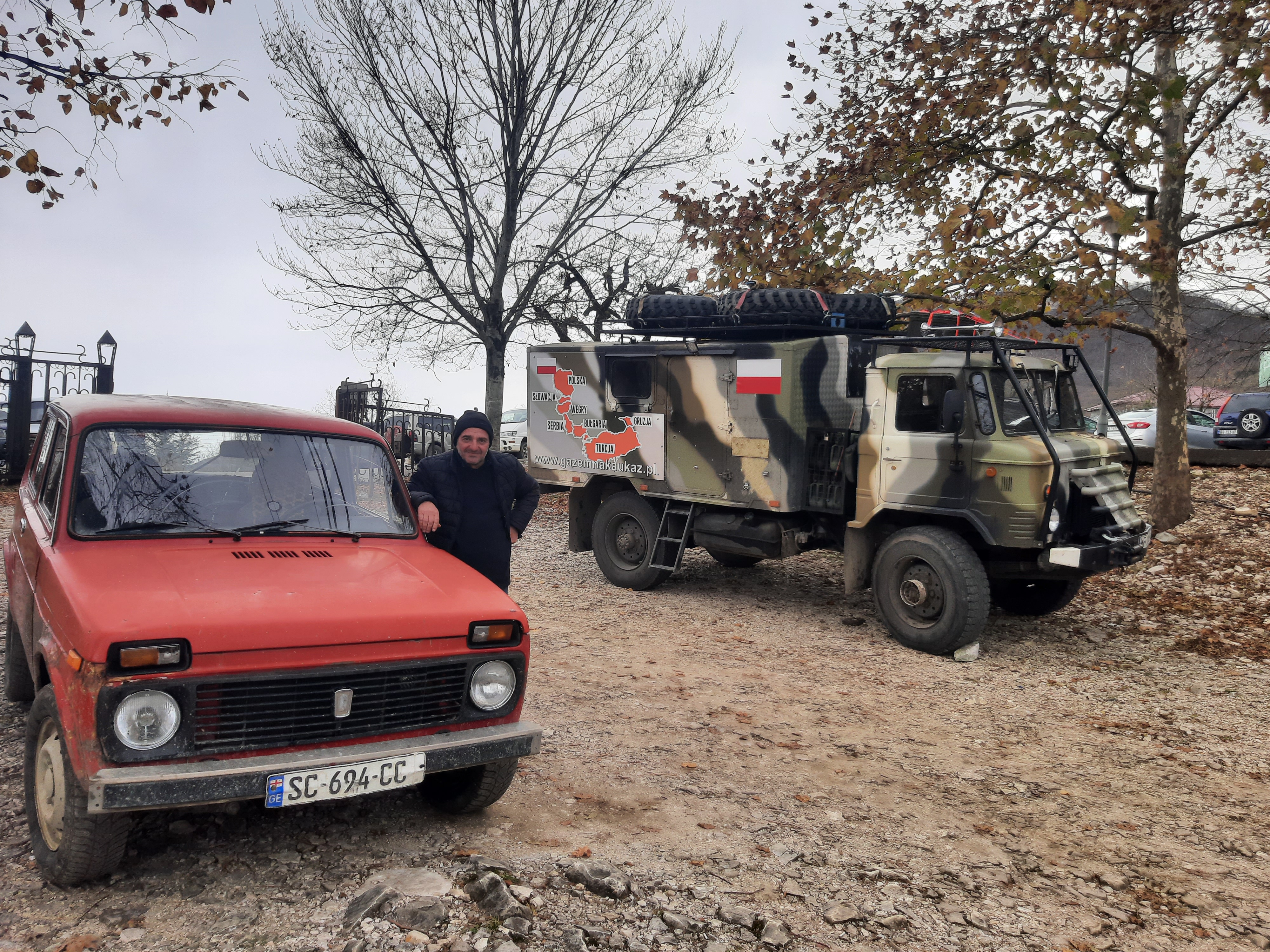 Czas w podróży 5 godzin, ilość przejechanych kilometrów – 70 Żeby sobie oczy nacieszyć przyrodą postanowiłem pojechać i zobaczyć kanion Martwili i kanion Okatse. Ten pierwszy można było obejrzeć idąc po wyznaczonych kładkach i też zobaczyć od strony wody płynąć pontonem. Wybrałem opcję full, (bilet do kosztował 40 lar) i razem z przepłynięciem się pontonem wśród skał. Ładne widoki, „rejs” trwał może wszystkiego ze 20 minut. Jeszcze można było przejść się pieszo wśród skałek i to wszystko. No może to nie był jakiś ósmy cud świata, ale zawsze to coś innego niż droga. Po tych atrakcjach pojechałem zobaczyć drugi kanion (Okatse), który był w sumie niedaleko. Jak zajechałem na miejsce cały parking był zajęty przez małe busy (Delicta) z napędem na 4 koła. Grupka kierowców wskazała mi miejsce gdzie mam stanąć i jak tylko się zatrzymałem od razu przyszli oglądać mojego Gaza. Wszyscy byli zainteresowani jaki to silnik, ile pali, czy szybko jedzie i jeszcze sporo innych pytań. Gdy już skończyli pytać wtedy ja zapytałem gdzie mam iść i co oglądać. Poszedł ze mną do kasy jeden z kierowców i po drodze zaczął mnie namawiać żebym zostawił swój samochód na parkingu, a on za 60 lari mnie gdzieś tam zawiezie, później będzie czekał i przywiezie z powrotem. Ponieważ połowy z tego co mówił nie zrozumiałem pomyślałem sobie dobrze i tak nie wiem gdzie iść/jechać i co oglądać. Poszedłem za kierowcą do Łady Niwy, która nie dość że miała popękaną szybę to wyglądała jakby zaraz miała się rozpaść. Nie ma co wybrzydzać, jedziemy, ku mojemu zdziwieniu „Ładziarka” doskonale sobie radziła na tej drodze, a droga faktycznie nie dla mojego Gaza – za wąska. Pan mnie zostawił przed wejściem na teren, wytłumaczył że mam iść, i że będzie czekał na końcu tej drogi. Bardzo malownicze widoki, a najfajniejsze było to, że szło się taką ażurową metalową chodnią podwieszoną do skał. No ktoś kto ma lęk wysokości myślę że czuł by się fatalnie, bo pod nogami widać było kilkusetmetrową przepaść (no może trochę przesadziłem pisząc kilkusetmetrową). Faktycznie na końcu drogi czekał kierowca razem z innymi kierowcami. Ten „mój” musiał tym innym naopowiadać o mnie i moim samochodzie, bo jak tylko podszedłem do nich, to powiedzieli że jestem maładiec i jeszcze chcieli mnie poczęstować szklanką wina. Ładnie podziękowałem, wymawiając się tym że jeszcze daleka droga przede mną. Na noc zatrzymałem się gdzieś na skraju jakiejś wioski