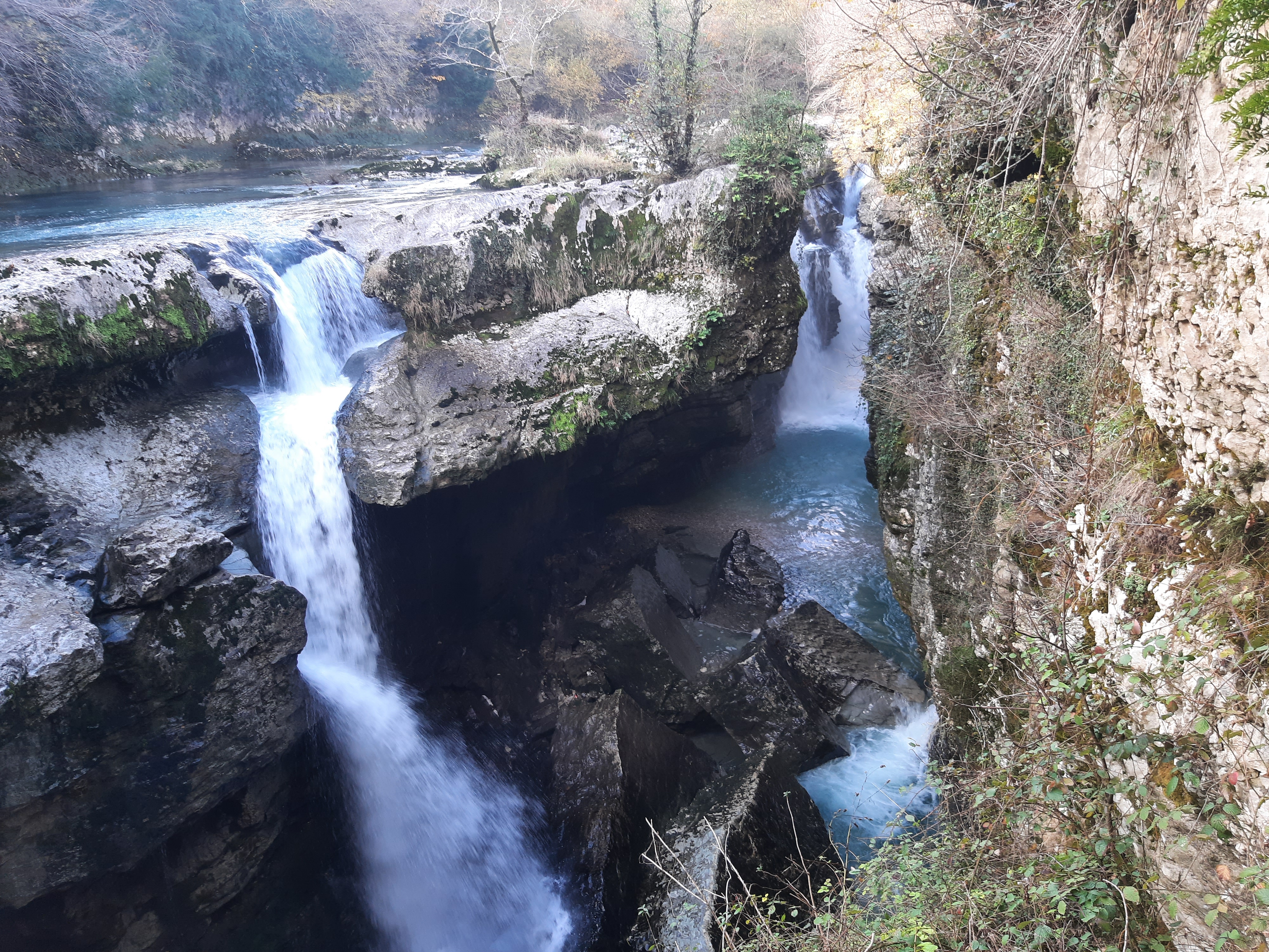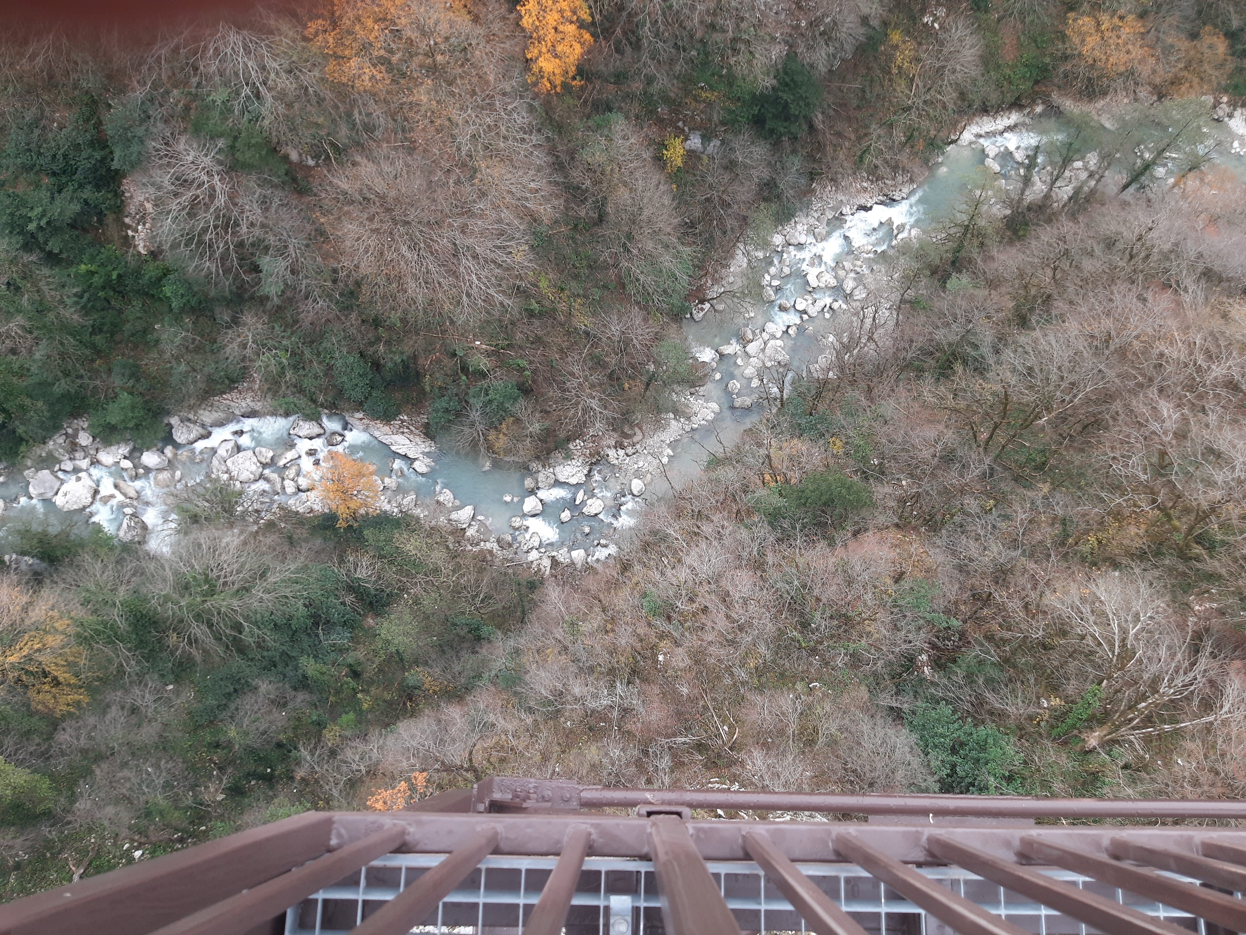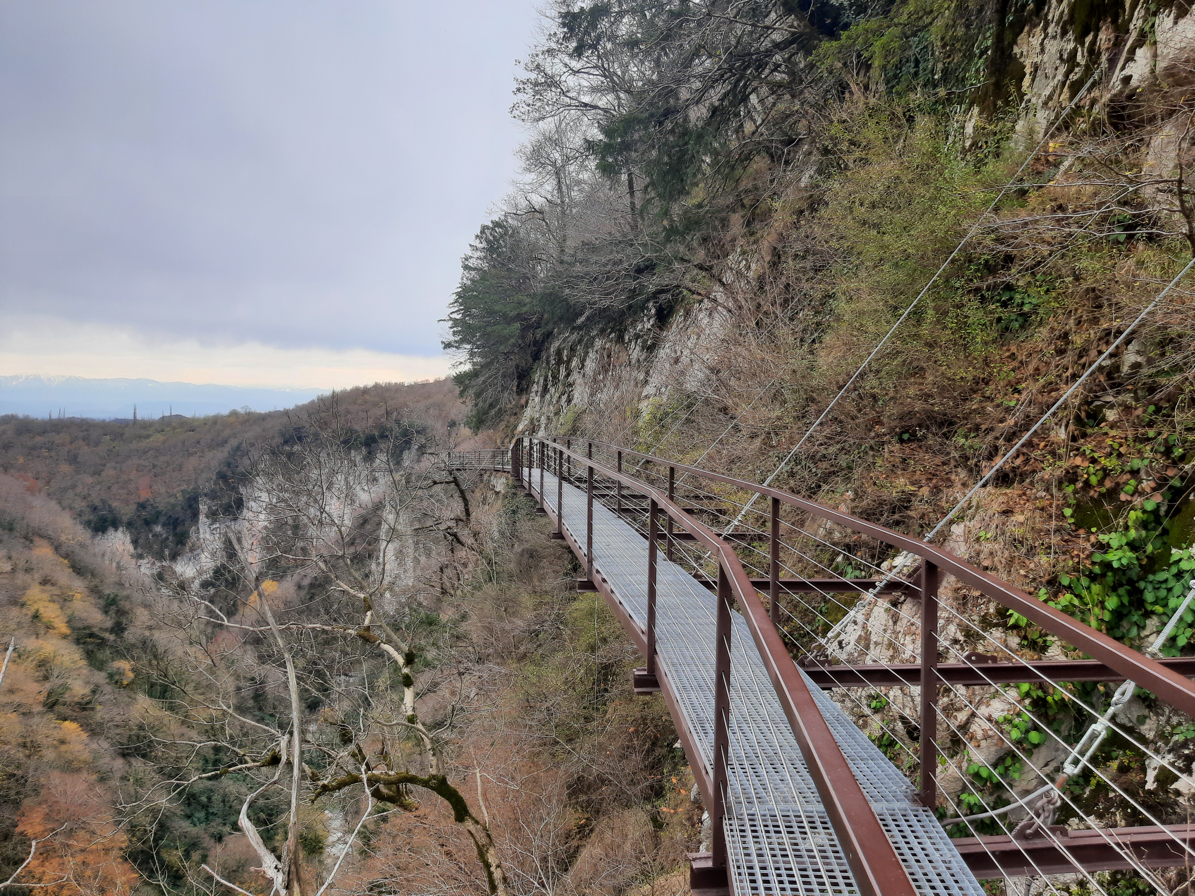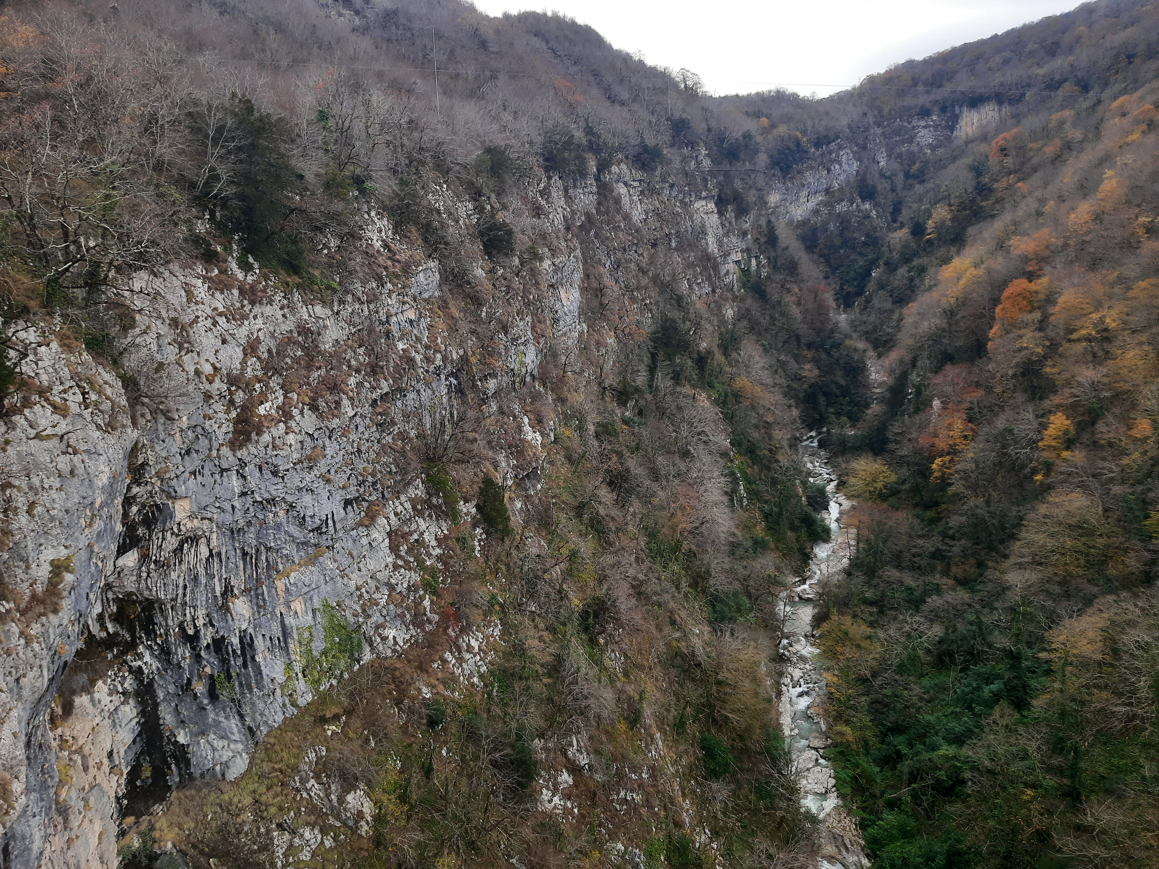 Czas w podróży 5 godzin, ilość przejechanych kilometrów – 70 Żeby sobie oczy nacieszyć przyrodą postanowiłem pojechać i zobaczyć kanion Martwili i kanion Okatse. Ten pierwszy można było obejrzeć idąc po wyznaczonych kładkach i też zobaczyć od strony wody płynąć pontonem. Wybrałem opcję full, (bilet do kosztował 40 lar) i razem z przepłynięciem się pontonem wśród skał. Ładne widoki, „rejs” trwał może wszystkiego ze 20 minut. Jeszcze można było przejść się pieszo wśród skałek i to wszystko. No może to nie był jakiś ósmy cud świata, ale zawsze to coś innego niż droga. Po tych atrakcjach pojechałem zobaczyć drugi kanion (Okatse), który był w sumie niedaleko. Jak zajechałem na miejsce cały parking był zajęty przez małe busy (Delicta) z napędem na 4 koła. Grupka kierowców wskazała mi miejsce gdzie mam stanąć i jak tylko się zatrzymałem od razu przyszli oglądać mojego Gaza. Wszyscy byli zainteresowani jaki to silnik, ile pali, czy szybko jedzie i jeszcze sporo innych pytań. Gdy już skończyli pytać wtedy ja zapytałem gdzie mam iść i co oglądać. Poszedł ze mną do kasy jeden z kierowców i po drodze zaczął mnie namawiać żebym zostawił swój samochód na parkingu, a on za 60 lari mnie gdzieś tam zawiezie, później będzie czekał i przywiezie z powrotem. Ponieważ połowy z tego co mówił nie zrozumiałem pomyślałem sobie dobrze i tak nie wiem gdzie iść/jechać i co oglądać. Poszedłem za kierowcą do Łady Niwy, która nie dość że miała popękaną szybę to wyglądała jakby zaraz miała się rozpaść. Nie ma co wybrzydzać, jedziemy, ku mojemu zdziwieniu „Ładziarka” doskonale sobie radziła na tej drodze, a droga faktycznie nie dla mojego Gaza – za wąska. Pan mnie zostawił przed wejściem na teren, wytłumaczył że mam iść, i że będzie czekał na końcu tej drogi. Bardzo malownicze widoki, a najfajniejsze było to, że szło się taką ażurową metalową chodnią podwieszoną do skał. No ktoś kto ma lęk wysokości myślę że czuł by się fatalnie, bo pod nogami widać było kilkusetmetrową przepaść (no może trochę przesadziłem pisząc kilkusetmetrową). Faktycznie na końcu drogi czekał kierowca razem z innymi kierowcami. Ten „mój” musiał tym innym naopowiadać o mnie i moim samochodzie, bo jak tylko podszedłem do nich, to powiedzieli że jestem maładiec i jeszcze chcieli mnie poczęstować szklanką wina. Ładnie podziękowałem, wymawiając się tym że jeszcze daleka droga przede mną. Na noc zatrzymałem się gdzieś na skraju jakiejś wioski