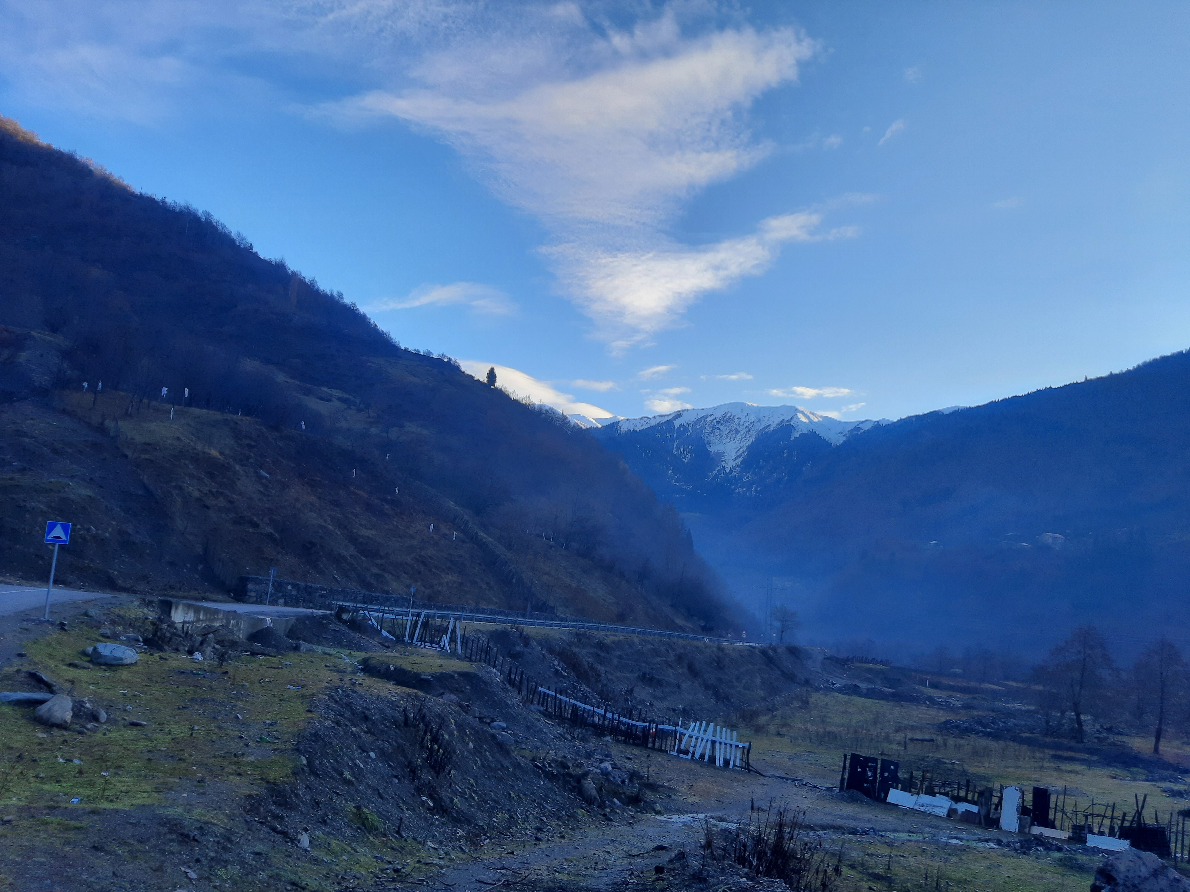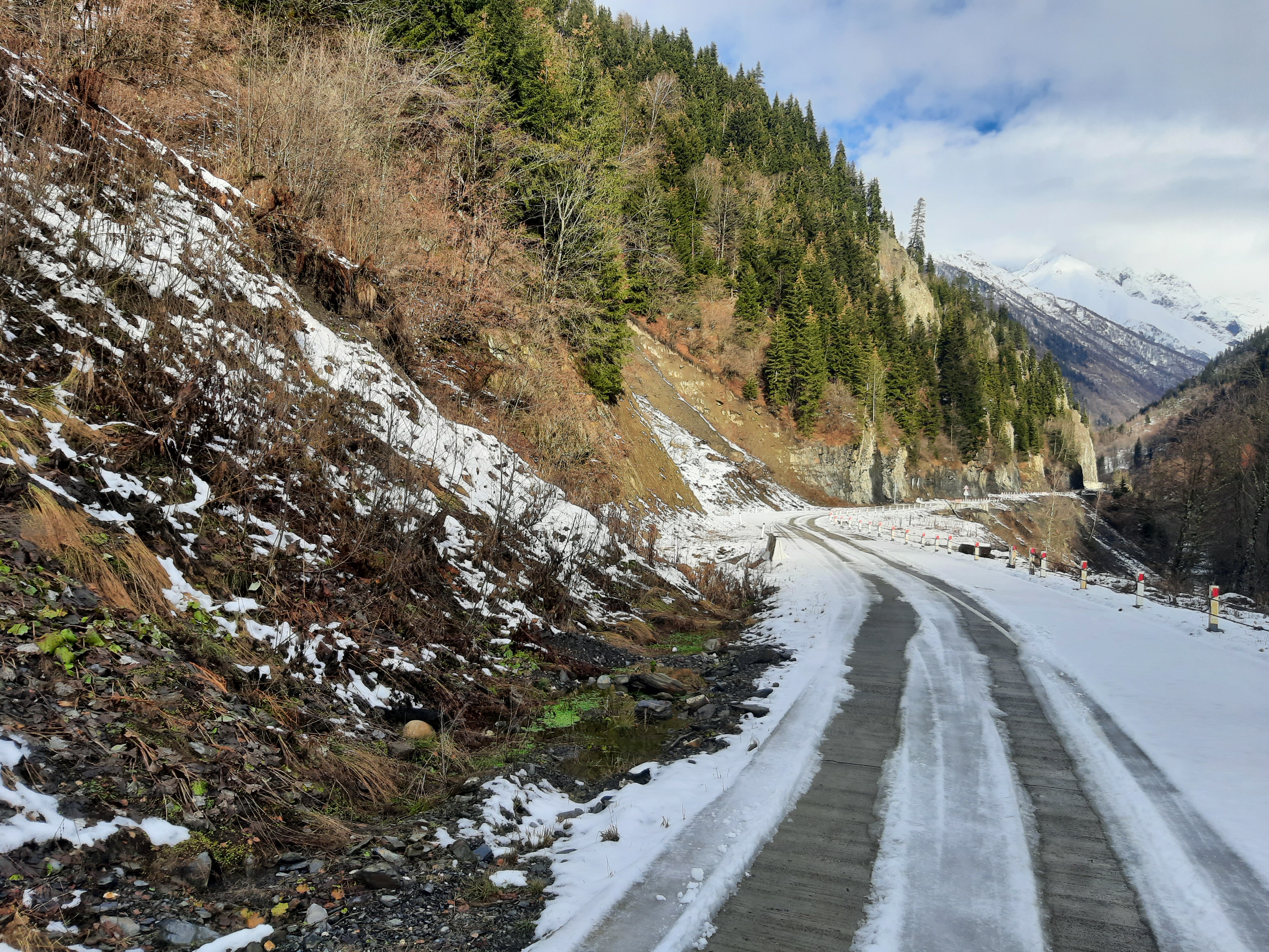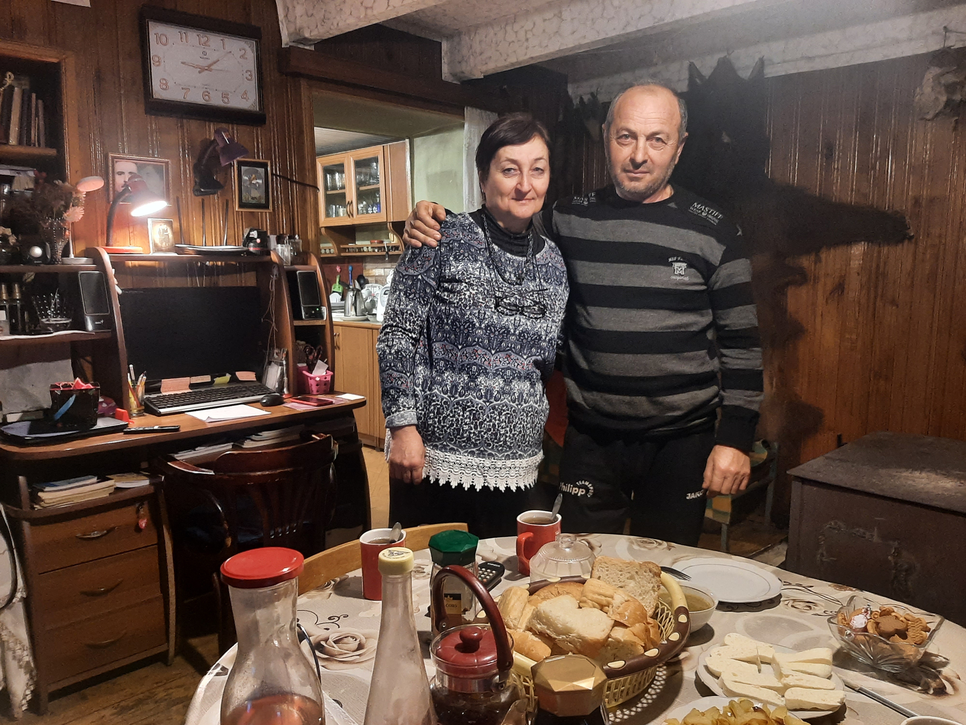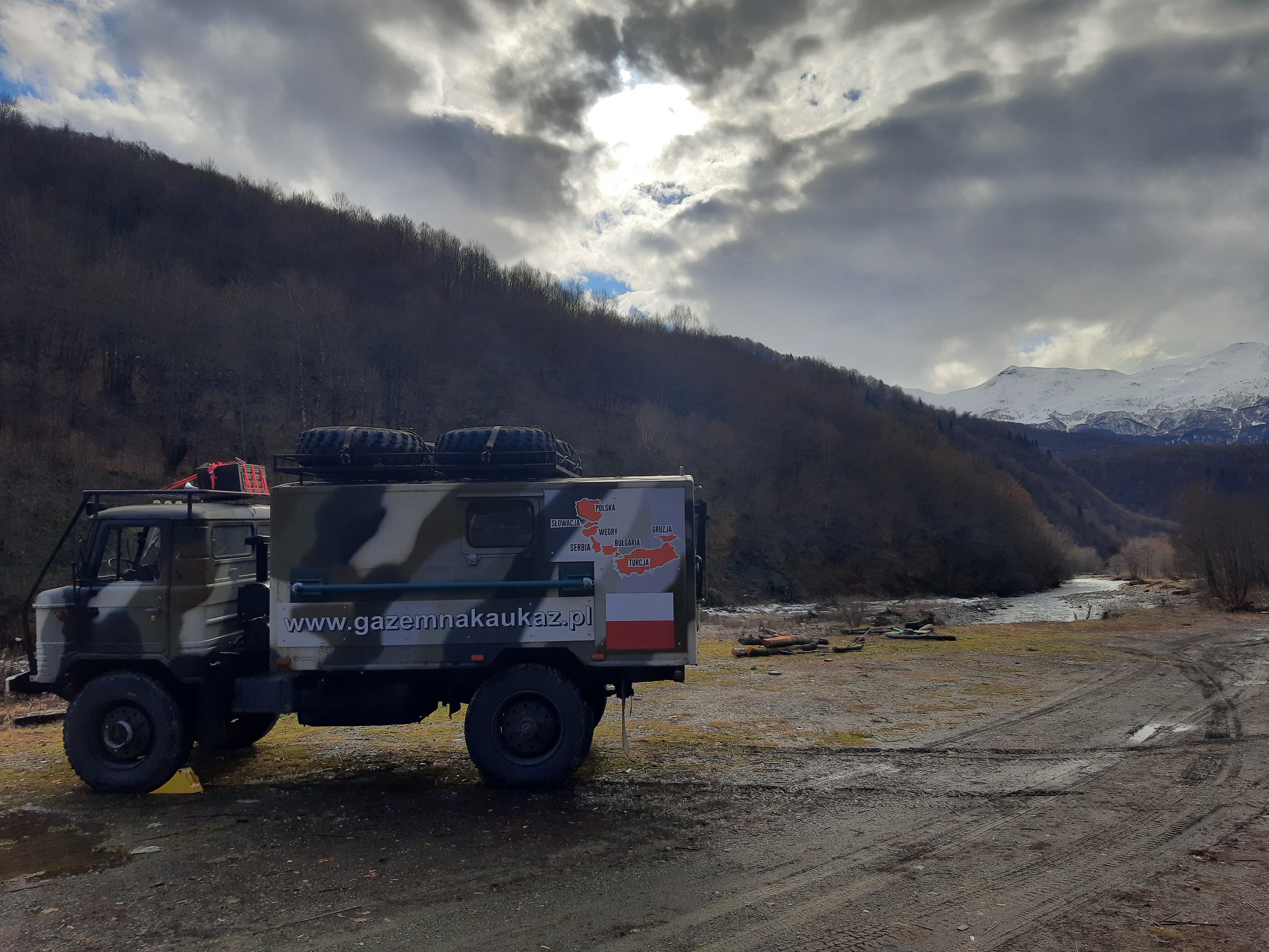 Czas w podróży 9 godzin, ilość przejechanych kilometrów – 150 Po nocy spędzonej pod gościnnym dachem Tułuli i Żaro, czas ruszać w drogę. Jeszcze rano zjedliśmy wspólnie śniadanie, poprosiłem o możliwość zrobienia in zdjęcia i jadę. Droga na początku taka zwykła, trochę zakrętów, pod górę na dół. W sumie nic trudnego, i widoki coraz ładniejsze. Po kilkunastu kilometrach droga się pogorszyła ze względu na to że w niektórych miejscach była zniszczona przez schodzące lawiny kamienne. Dla mojego samochodu to żaden problem, zresztą wyprzedzały mnie samochody terenowe które szybciej i sprawniej się poruszały na tej wąskiej drodze. Problemy zaczęły się już wyżej, tzn. zaczął się śnieg na drodze. Z początku niewiele, ale w miarę dalszej jazdy pod górę było go coraz więcej. Auta, które mnie wcześniej wyprzedzały, teraz mijały mnie jadąc w przeciwną stroną niż ja. Tak sobie pomyślałem że chyba jest jakiś kłopot tam wyżej, skoro oni wracają. I faktycznie po następnych parunastu kilometrach zauważyłem ślady na drodze samochodów, które zawracały. Droga wąska, z jednej strony skały, z drugiej przepaść, ślisko i pod górę. Te małe samochody widać po śladach zawracały na kilka razy, no to ciekawe gdzie ja zawrócę, jak nie uda mi się pojechać dalej. Zatrzymałem jakiegoś kierowcę w Toyocie Land Cruiser, który wracał i zapytałem go o drogę i czy dojadę do Ushguli. Droga zasypana i ślisko, a do Ushguli i tak nie dojedziesz powiedział. No to trzeba zawracać, tylko jak i gdzie, jak wszędzie wąsko. Jadąc dalej szukałem trochę szerszego miejsca. Gaz, po pierwsze ma bardzo ograniczony skręt, po drugie wspomaganie takie byle jakie. Chcąc zakręcić często muszę robić to na „bujanego” czyli trochę bujać samochodem żeby móc skręcić kierownicą. Gdy udało mi się znaleźć szerszy kawałek drogi, z duszą na ramieniu na kilka razy udało mi się zawrócić. No to nici z mojej wycieczki do wiosek, trudno i tak byłem przygotowany że nie dojadę, ale trzeba było spróbować. Jeszcze zrobiłem sobie obiad w ładnym miejscu nad rzeką, trochę zdjęć. Po drodze w jakiejś wiosce zobaczyłem przed prywatnym domem jakiś pomnik, niestety plac był ogrodzony i zamknięty. Z daleka wyglądał jak Stalin, ale czy to możliwe, nie wiem. Nocleg wypadł gdzieś przy posterunku Policji.