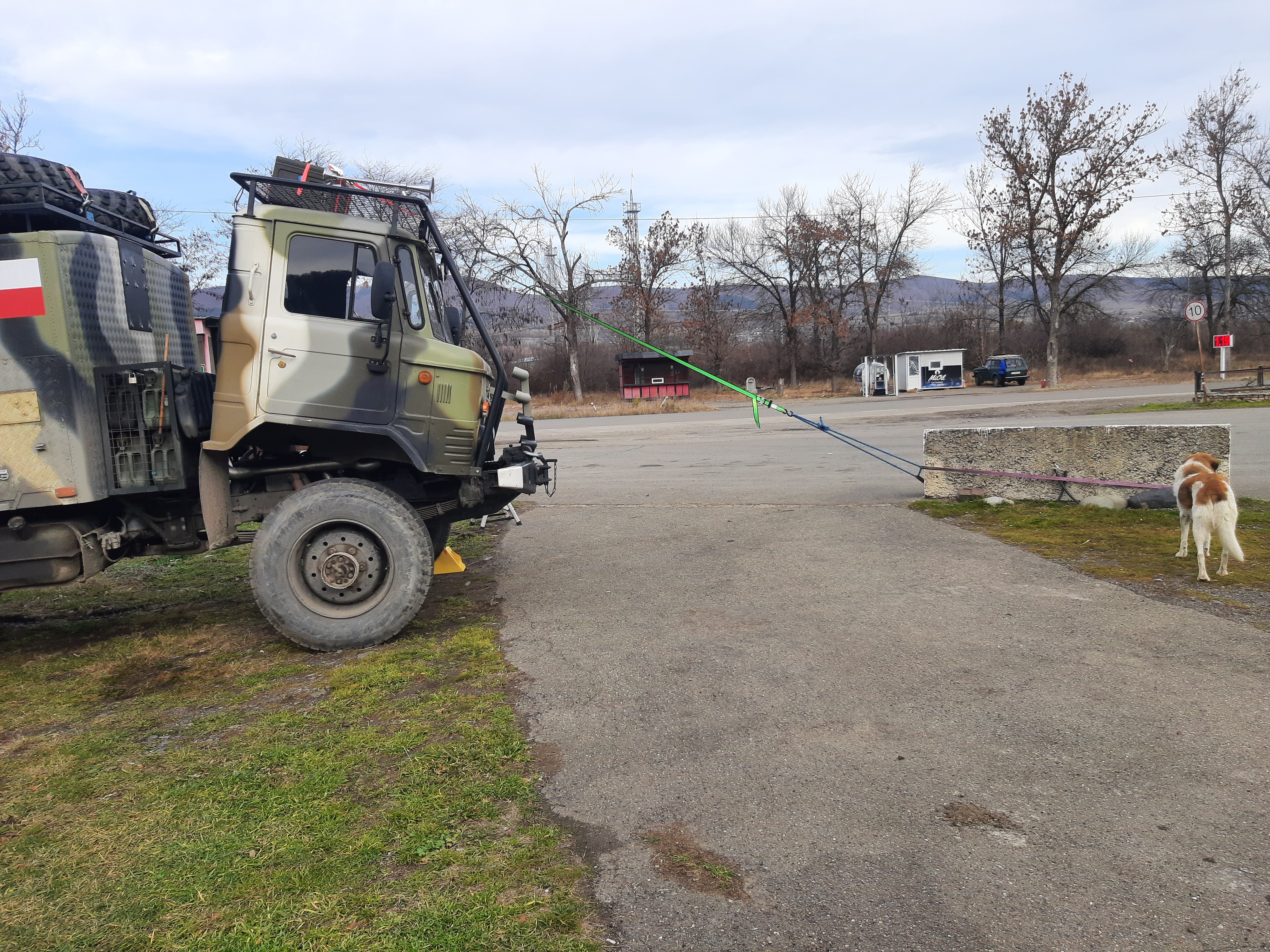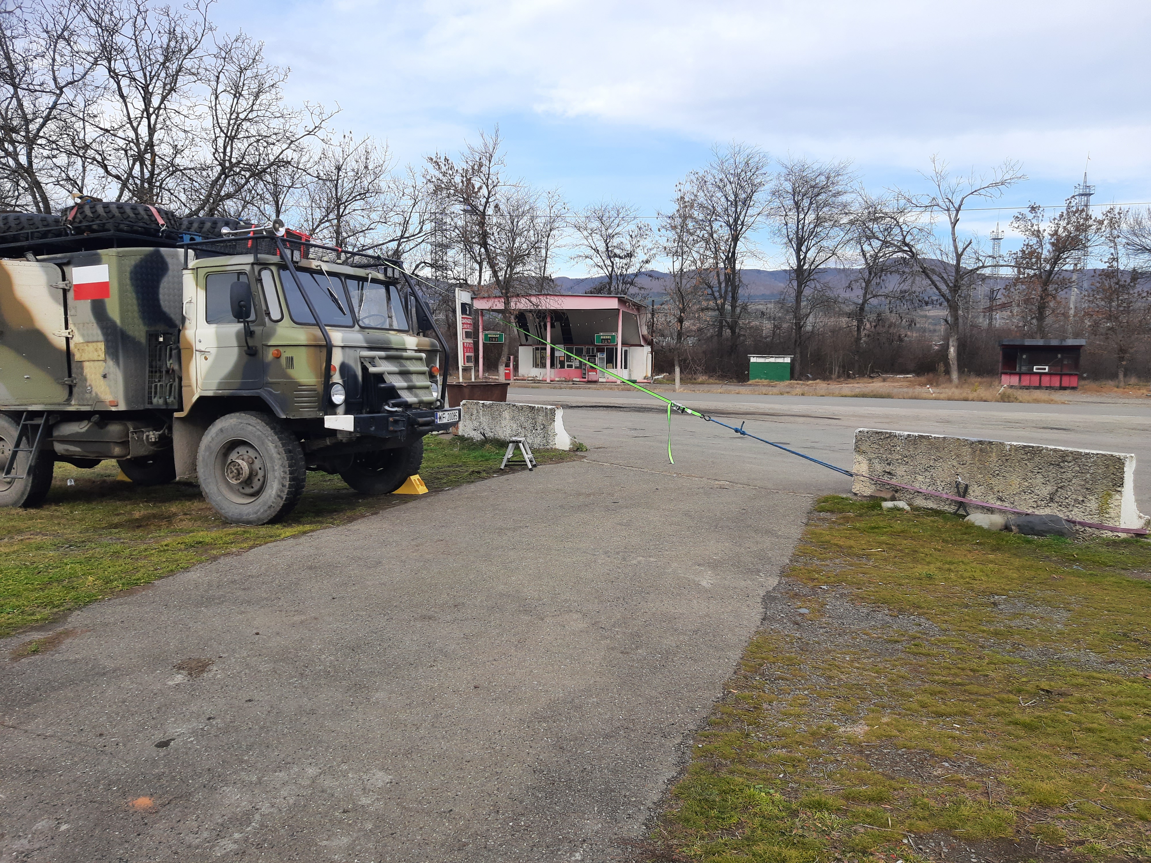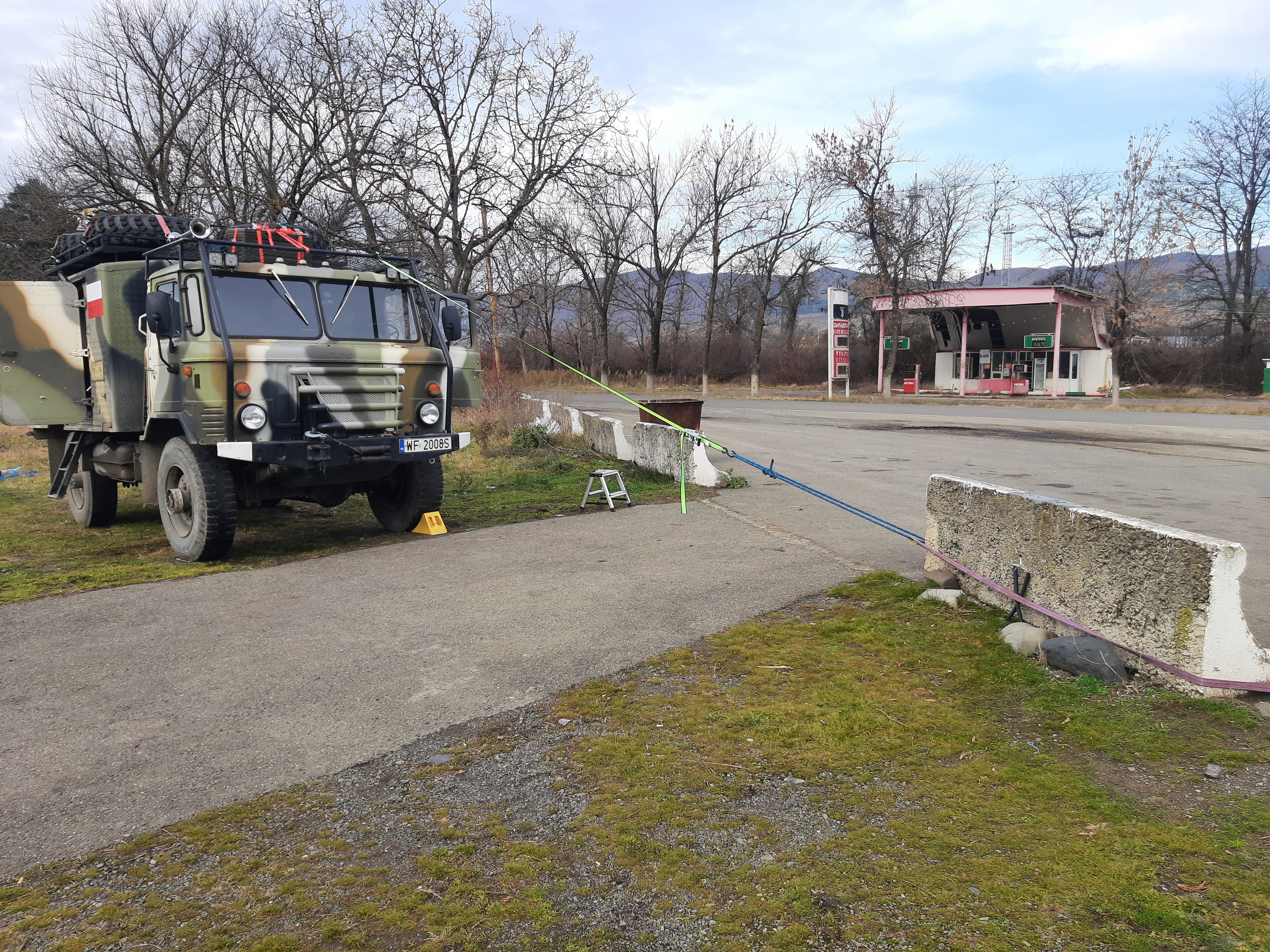 21-XI-2024 czas w podróży 8 godzin, ilość przejechanych kilometrów – 230 22-XI-2024 czas w podróży 3 godzin, ilość przejechanych kilometrów – 100 Plan na następne dni jest prosty. Jadę do skalnego miasta Wardzia, później już zaczynam powrót do domu. Rano postanowiłem zrobić większy przegląd samochodu i smarowanie wszystkich kalamitek. Zrobiłem zdjęcie mojego sposobu podnoszenia kabiny. Z tymi pracami zeszło mi się parę godzin, więc liczyłem się z tym że dzisiaj nie dojadę tam gdzie zamierzałem, raptem przejechałem 100 kilometrów jak zaczął się zmierzch. Na noc zostałem w hotelu.