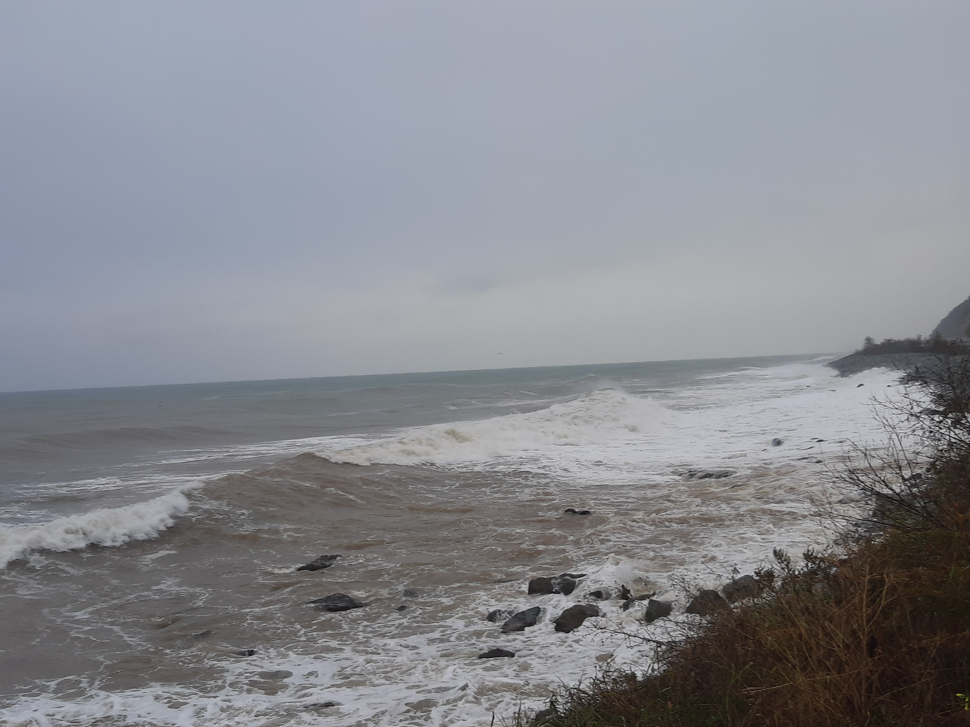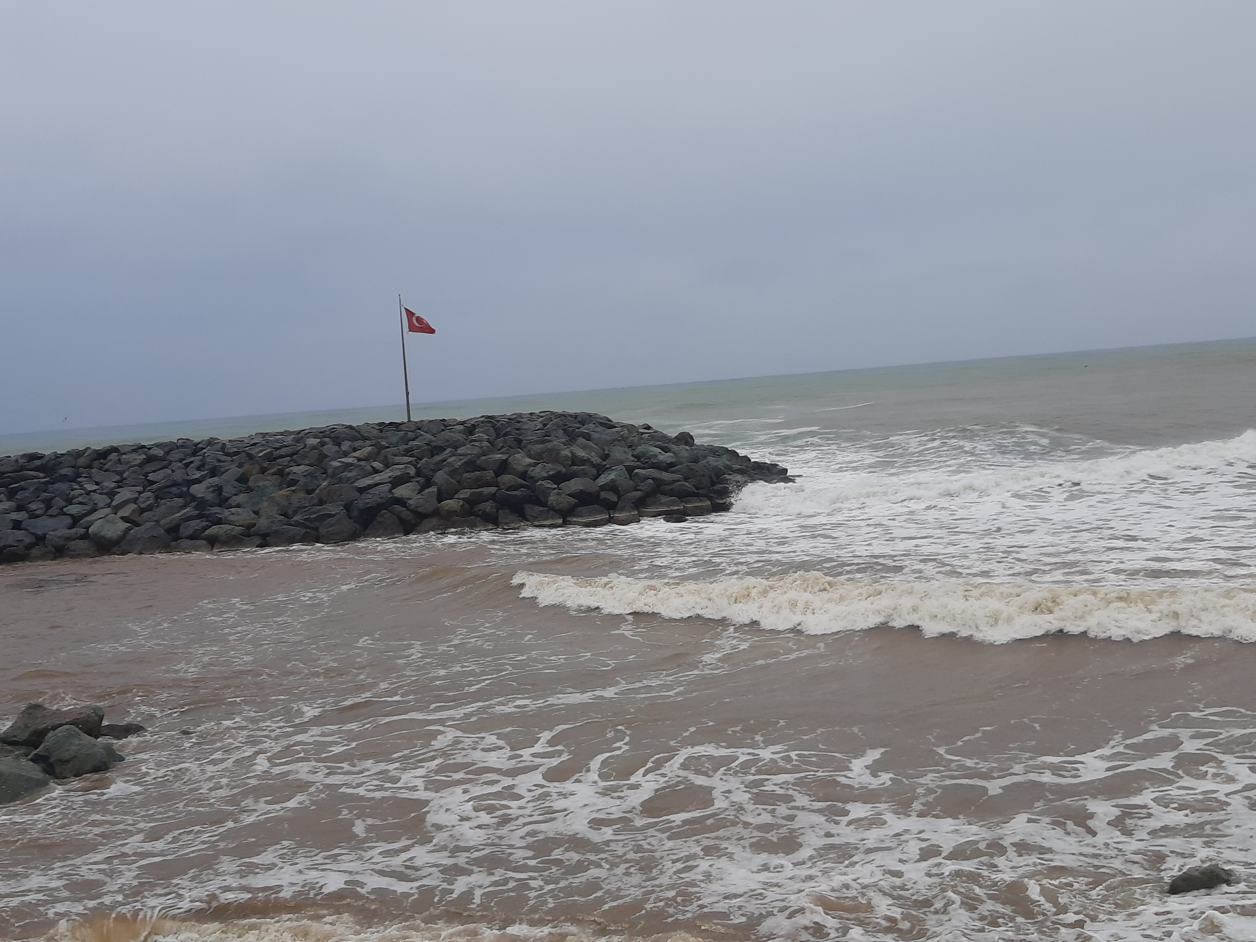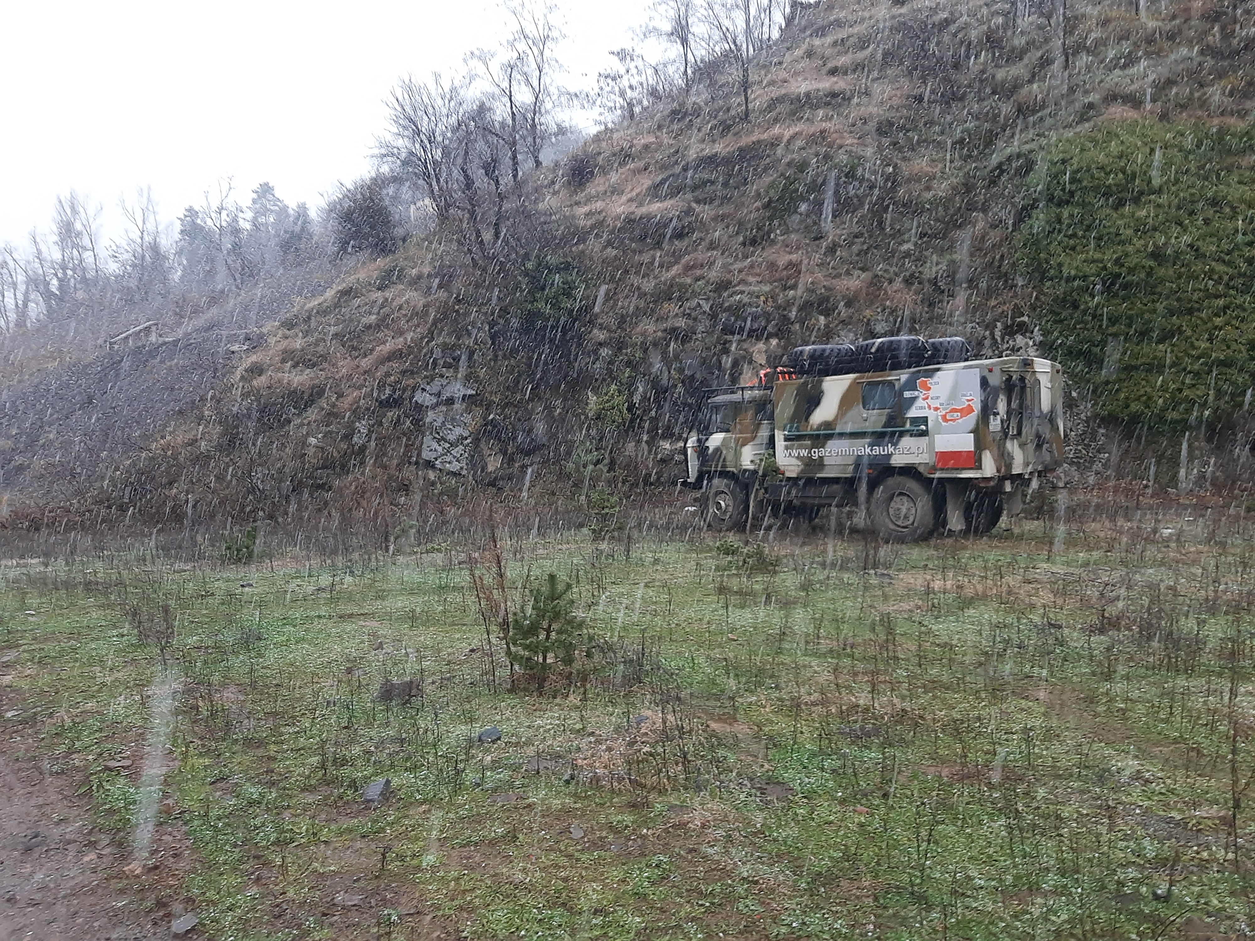 Czas w podróży 9 godzin, ilość przejechanych kilometrów – 220 Przez całą noc padał deszcz, razem z szumiącą rzeką tworzyli duet przy którym szybko usnąłem. Pogoda nie poprawiła się, a nawet znacznie pogorszyła, bo deszcz zastąpił gęsty śnieg. Długo się nie zbierałem, tylko kawa i ruszyłem. Deszcz ze śniegiem był czasami tak mocny że miejscami prawie że jechałem po omacku. Wycieraczki źle zbierały a czasami się całkiem zaklejały od mokrego śniegu. Wycieraczki to jeszcze nic, gdzieś na podszybiu, a może to uszczelka pod szybą (diabli wiedzą) była nieszczelność. Przy małych opadach to nic nie znaczyło, natomiast teraz dało o sobie znać. Jak skręcałem w prawo, to lało mi się na lewą nogę i odwrotnie. Droga była kręta i nie było się gdzie się zatrzymać więc po niedługim czasie obie nogi miałem mokre. Zatrzymałem się i zmieniłem na buty trekkingowe, ale i tak co jakiś zakręt czułem że mi leci za cholewki. Dobra, nie ma co narzekać. Na granicy Gruzińskiej bez kolejki i bez problemu szybko mnie odprawili, to samo na przejściu Tureckim, szybko i bez żadnych formalności. Jadąc nad samym morzem cały czas widziałem sztormowe groźne bardzo wysokie fale. Na noc zatrzymałem się koło stacji benzynowej z ładnym widokiem na morze, tuż obok meczetu. Jednakże gdy na kolację zacząłem sobie robić smażoną na smalcu kiełbasę, uznałem że to jest bardzo duży nietakt, a nawet swego rodzaju profanacja z mojej strony (tu meczet, tu wieprzowina). Chcąc nie chcąc przestawiłem samochód na drugą stronę stacji, gdzie już nie było widoku na morze, tylko na ścianę, no ale było znacznie dalej od meczetu.