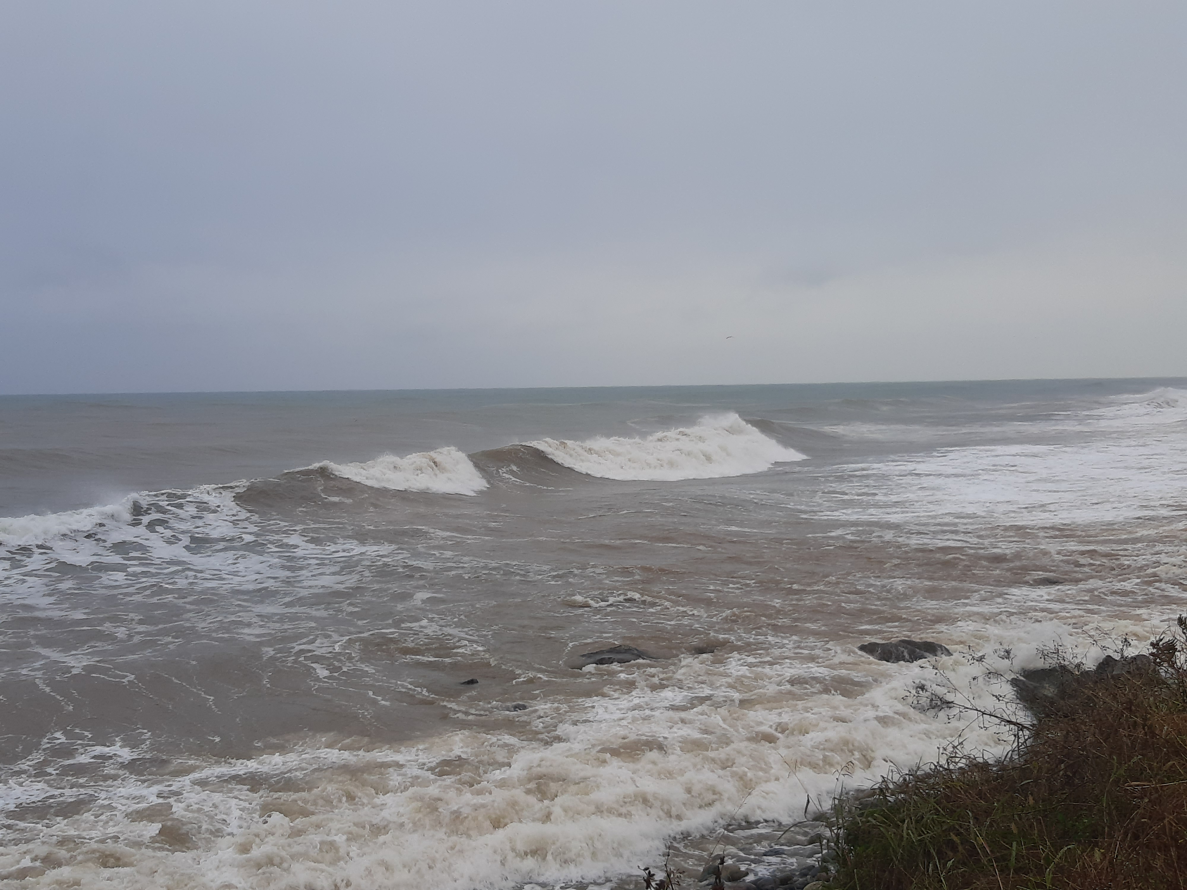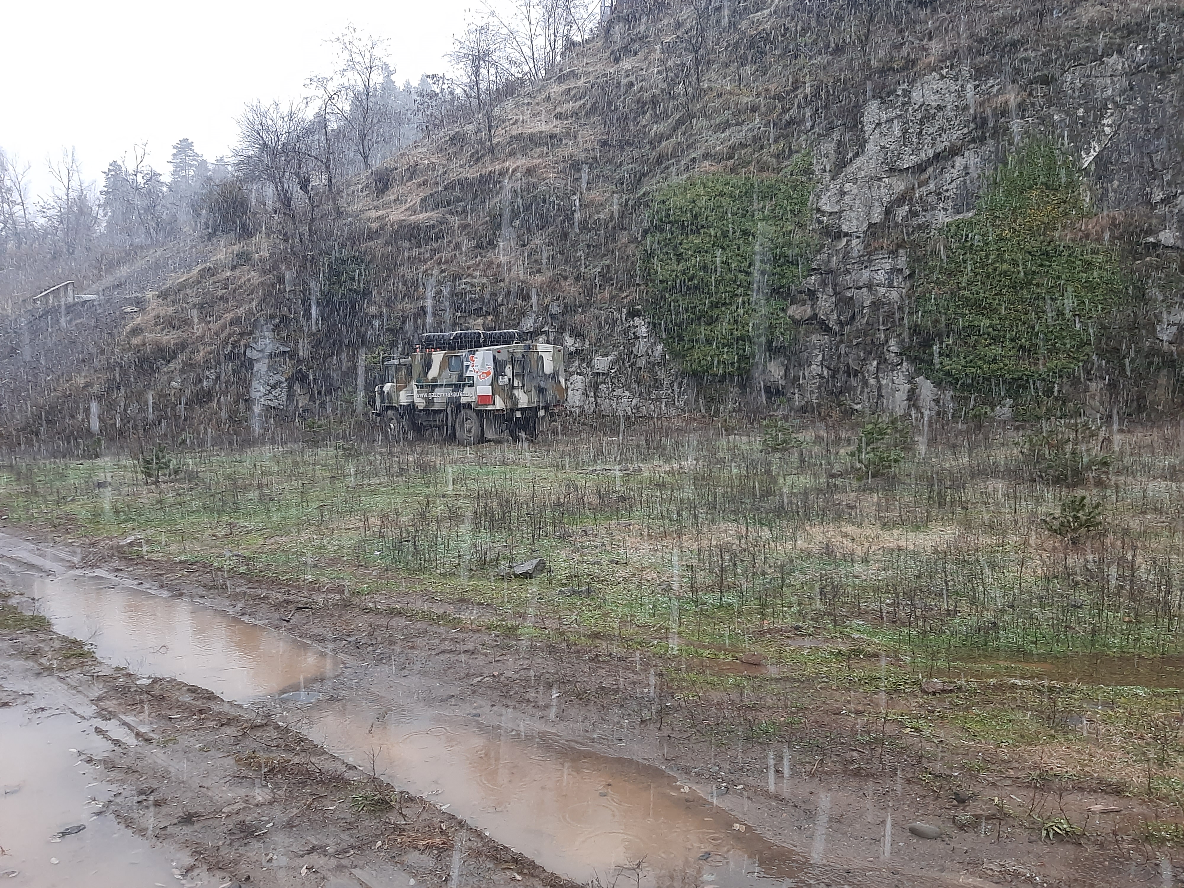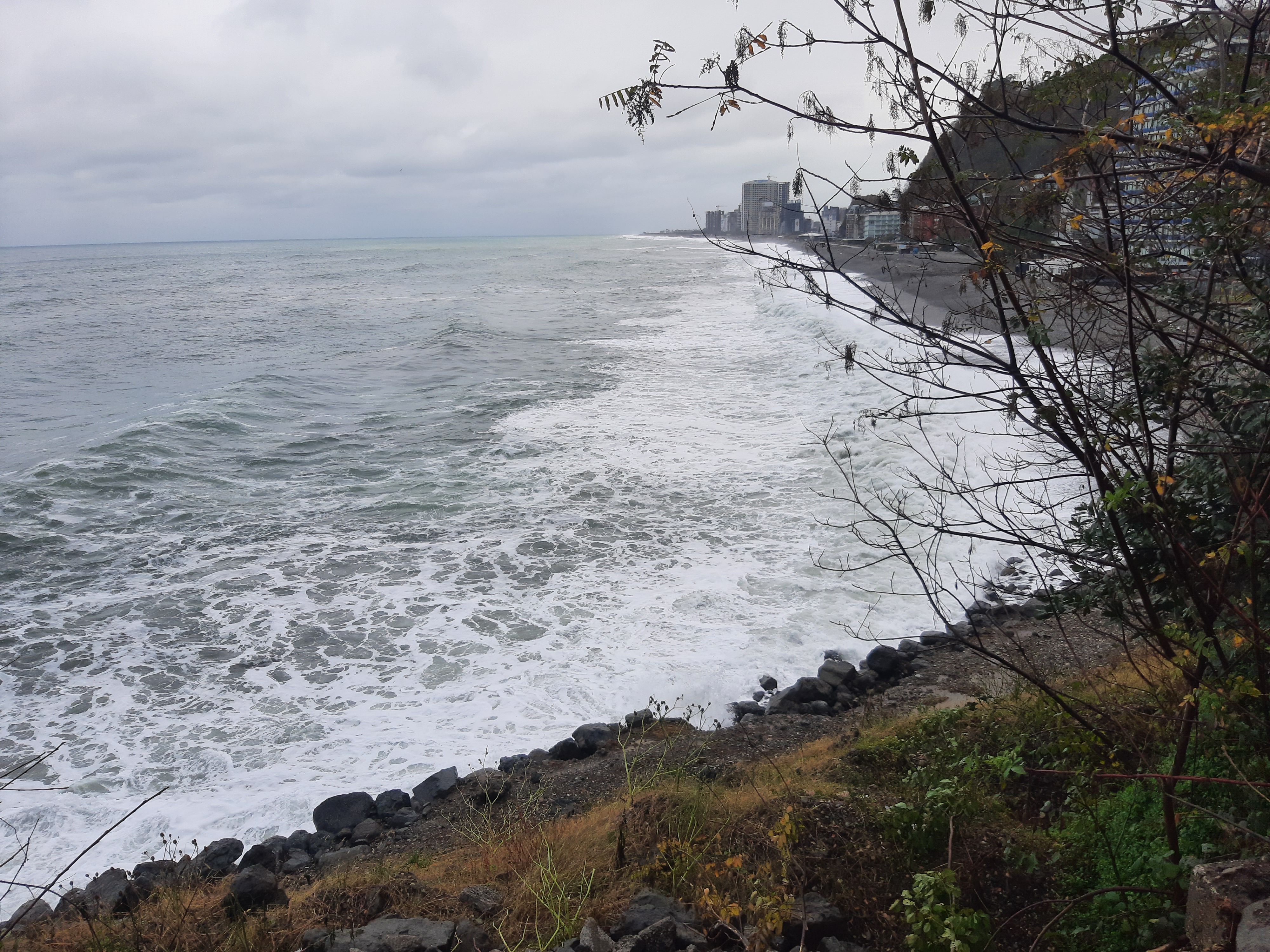 Czas w podróży 9 godzin, ilość przejechanych kilometrów – 220 Przez całą noc padał deszcz, razem z szumiącą rzeką tworzyli duet przy którym szybko usnąłem. Pogoda nie poprawiła się, a nawet znacznie pogorszyła, bo deszcz zastąpił gęsty śnieg. Długo się nie zbierałem, tylko kawa i ruszyłem. Deszcz ze śniegiem był czasami tak mocny że miejscami prawie że jechałem po omacku. Wycieraczki źle zbierały a czasami się całkiem zaklejały od mokrego śniegu. Wycieraczki to jeszcze nic, gdzieś na podszybiu, a może to uszczelka pod szybą (diabli wiedzą) była nieszczelność. Przy małych opadach to nic nie znaczyło, natomiast teraz dało o sobie znać. Jak skręcałem w prawo, to lało mi się na lewą nogę i odwrotnie. Droga była kręta i nie było się gdzie się zatrzymać więc po niedługim czasie obie nogi miałem mokre. Zatrzymałem się i zmieniłem na buty trekkingowe, ale i tak co jakiś zakręt czułem że mi leci za cholewki. Dobra, nie ma co narzekać. Na granicy Gruzińskiej bez kolejki i bez problemu szybko mnie odprawili, to samo na przejściu Tureckim, szybko i bez żadnych formalności. Jadąc nad samym morzem cały czas widziałem sztormowe groźne bardzo wysokie fale. Na noc zatrzymałem się koło stacji benzynowej z ładnym widokiem na morze, tuż obok meczetu. Jednakże gdy na kolację zacząłem sobie robić smażoną na smalcu kiełbasę, uznałem że to jest bardzo duży nietakt, a nawet swego rodzaju profanacja z mojej strony (tu meczet, tu wieprzowina). Chcąc nie chcąc przestawiłem samochód na drugą stronę stacji, gdzie już nie było widoku na morze, tylko na ścianę, no ale było znacznie dalej od meczetu.